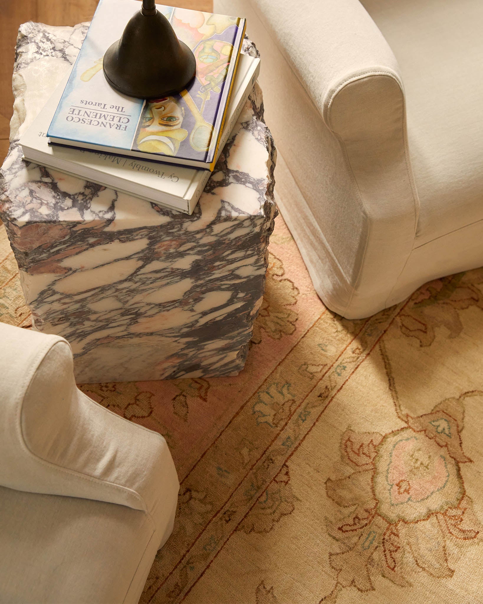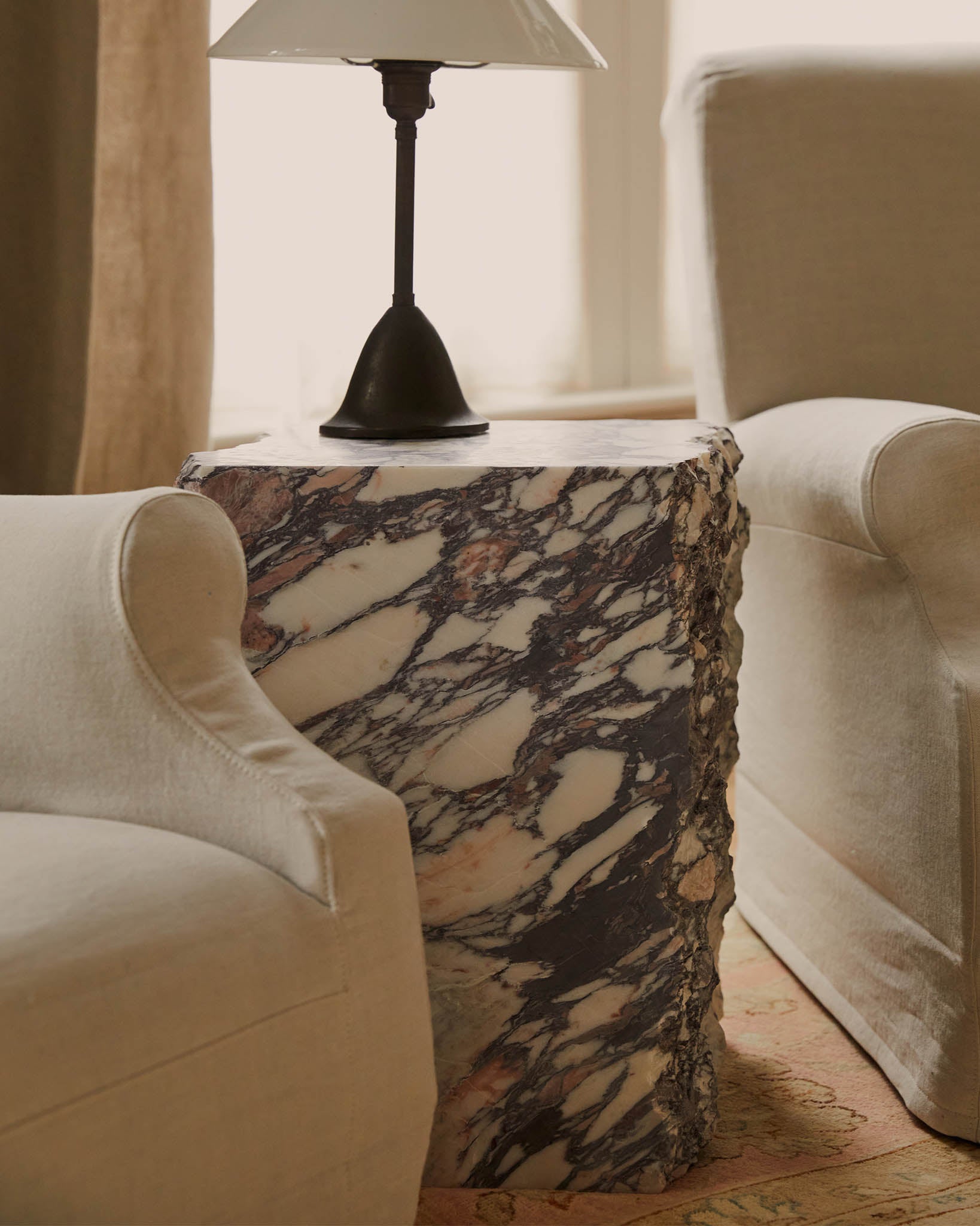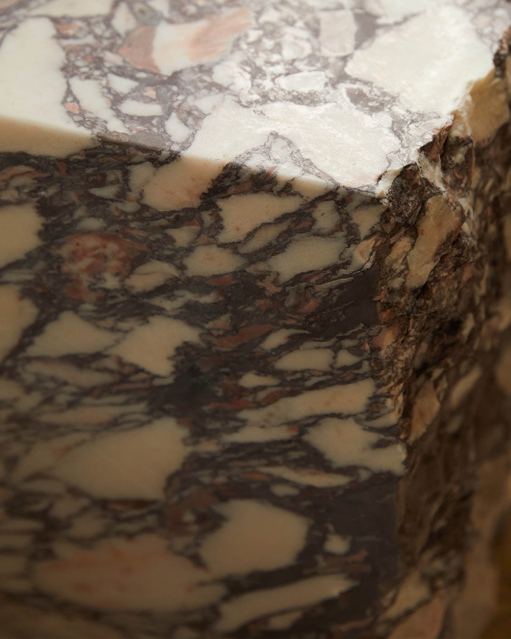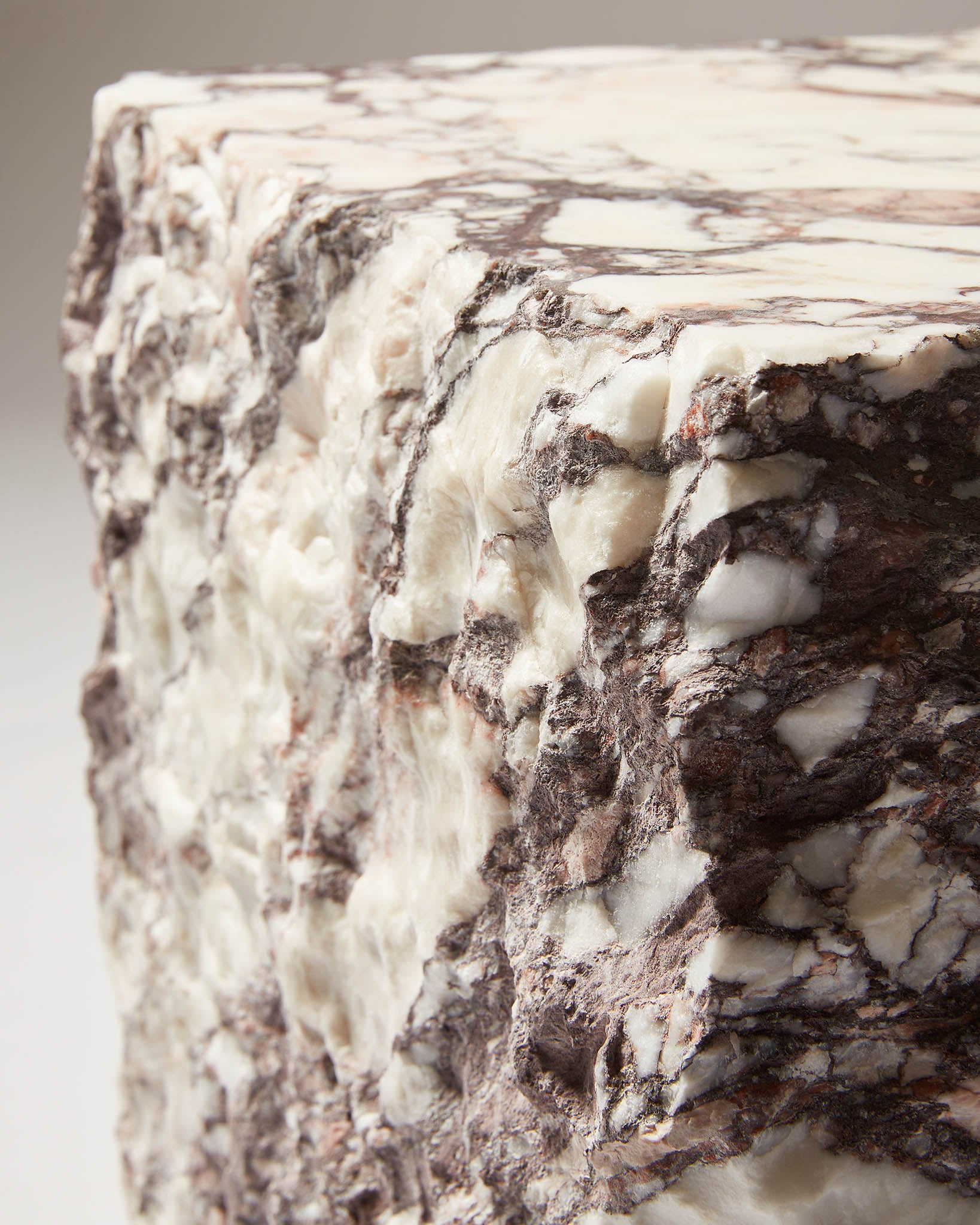 Carved by hand in Italy, from solid Calacatta Viola marble. The top and one side of the piece are honed, whilst the other three sides are hand-chiselled, creating a beautiful and unusual finish. This piece is available in a wide selection of marbles on request, please enquire for further information.