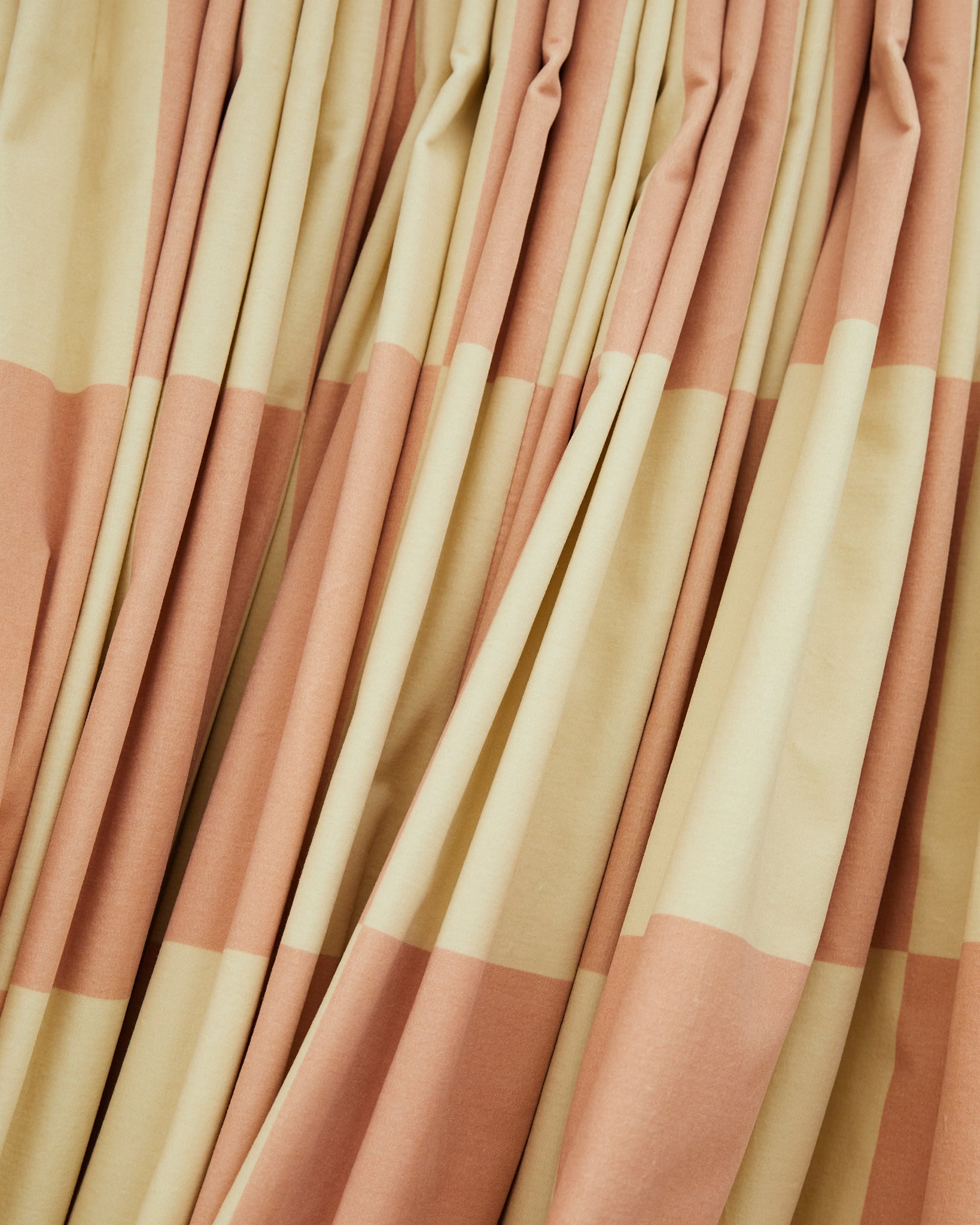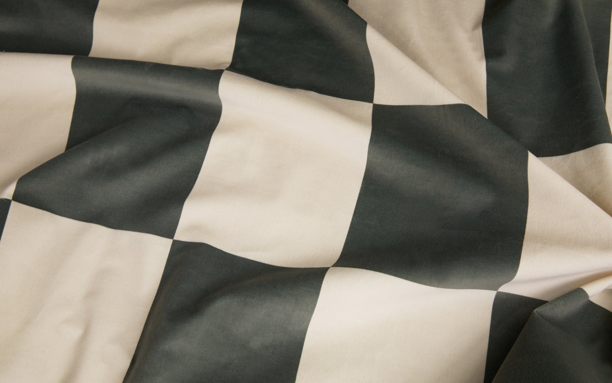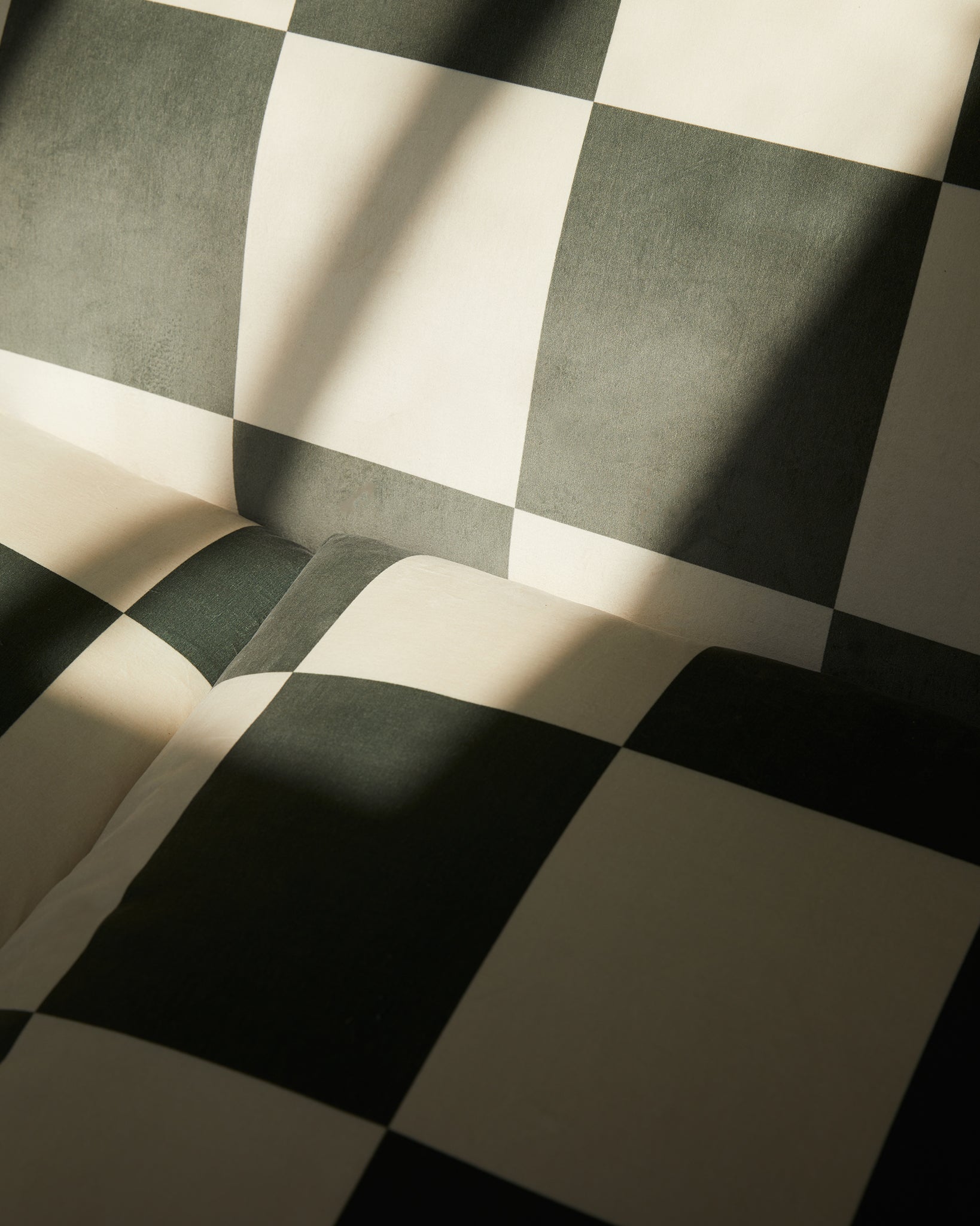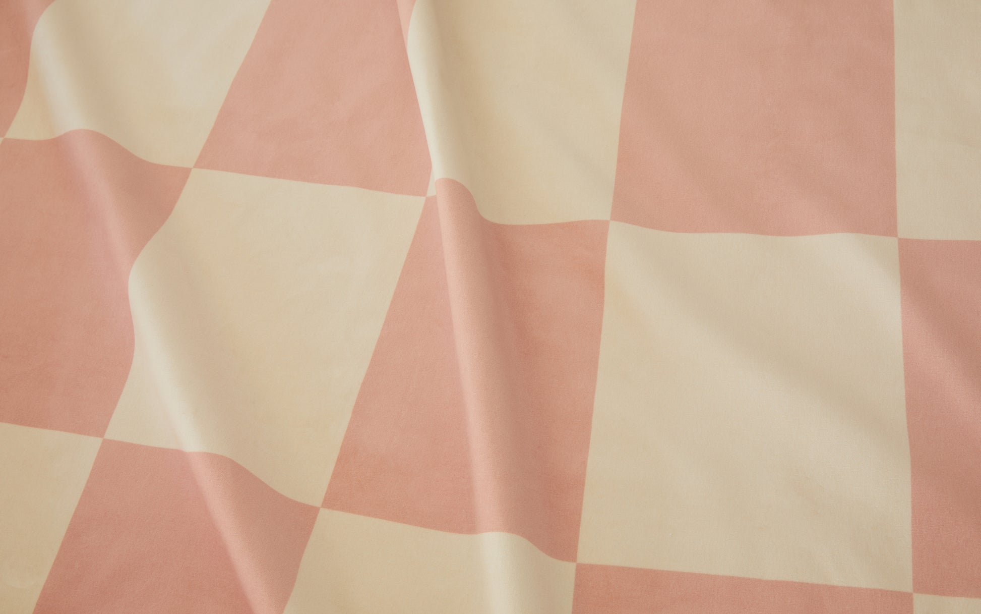 Our over-sized rectangular checkerboard design, printed onto the softest cotton velvet. Peony is a pale, soft pink, beautifully creamy, the shade changes colour in different lights. Sage is an enigmatic charcoal green. Depending on the light, the shade varies between a deeper charcoal-green with blue undertones and a lighter silvery-green.