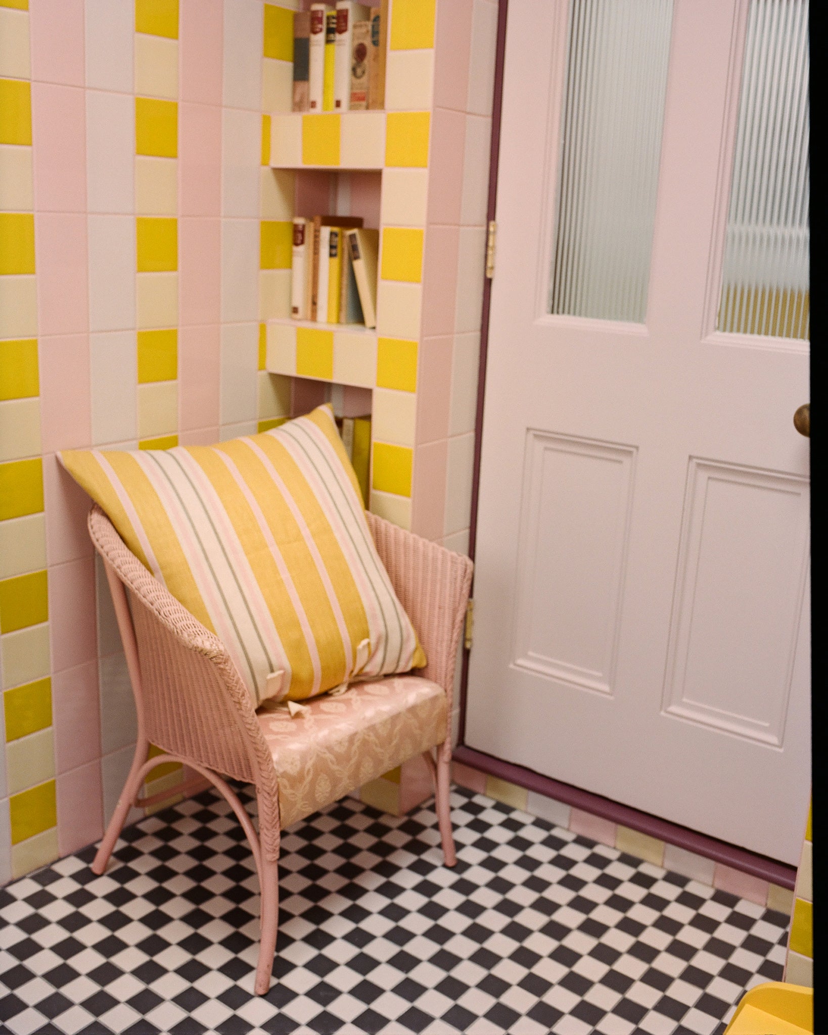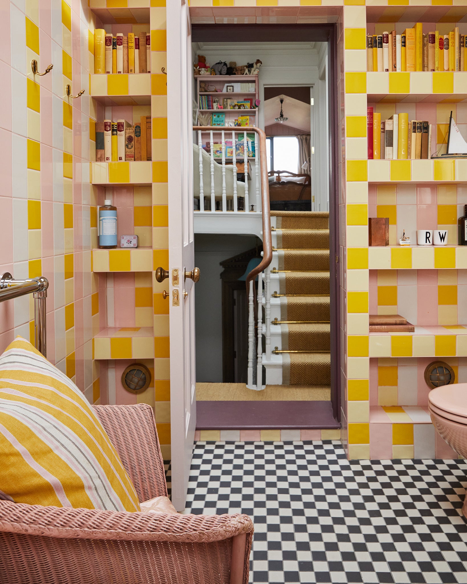 'Ochre' is a combination of golden yellow and pale pink, grounded by a rich chocolate brown, which was inspired by the colour palette in Angus and Charlotte’s stripy "battenberg" bathroom at home.