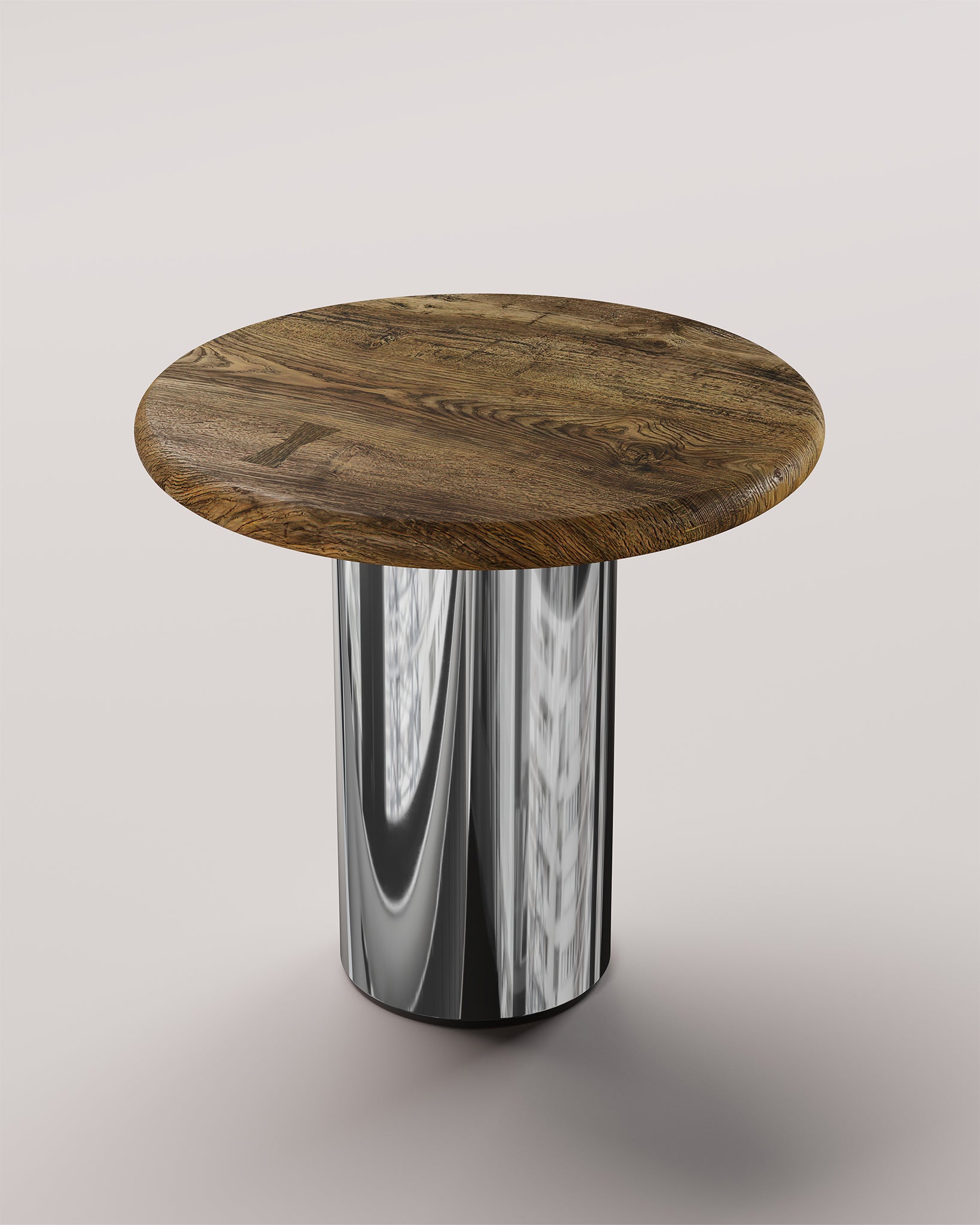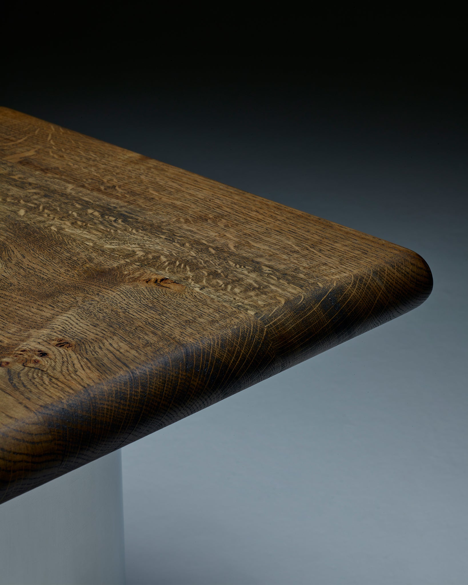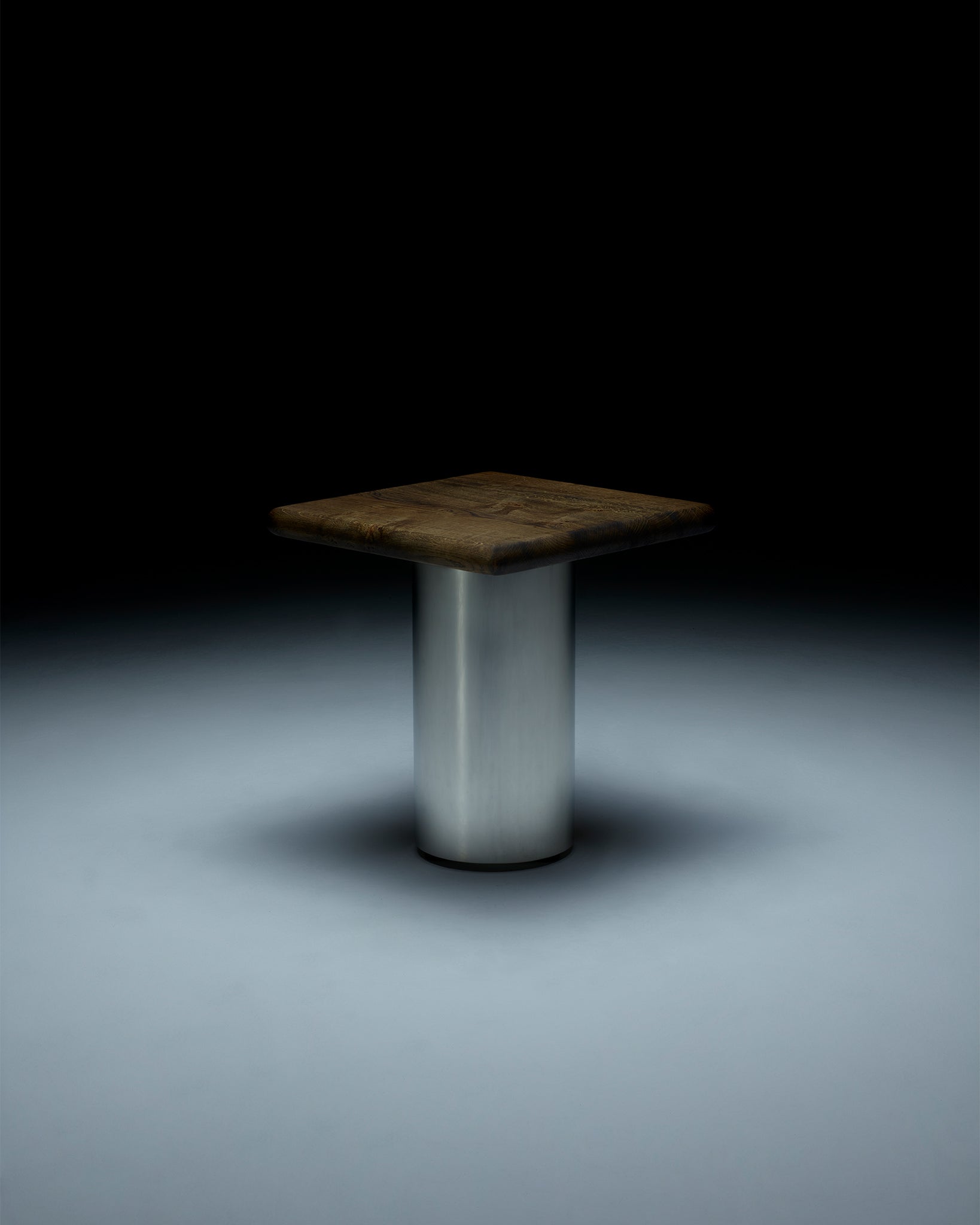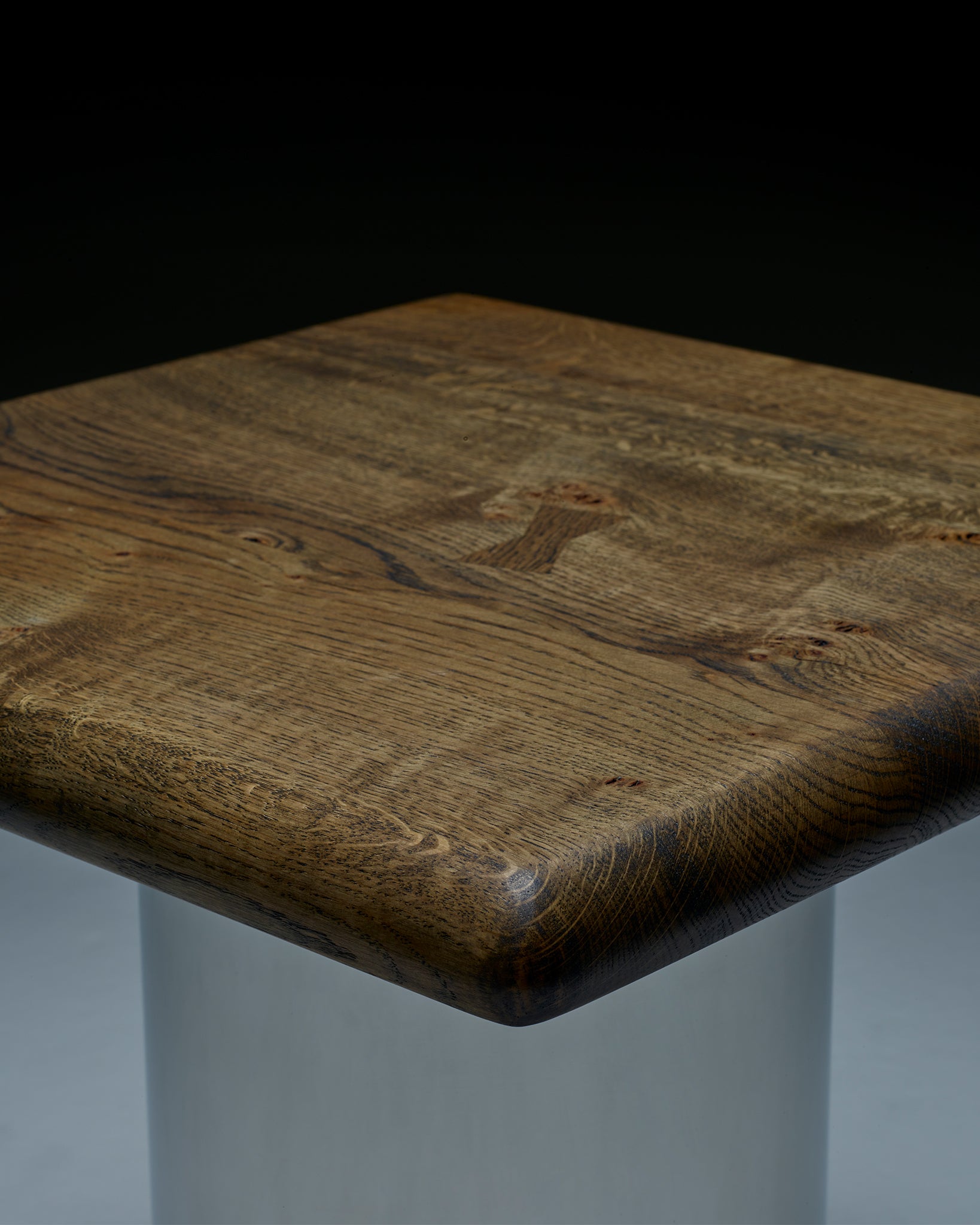 A versatile side table that brings Buchanan Studio's signature edge to any space. Available in three geometric shapes- square, circle and triangle. The cylindrical base is hand crafted in England from Stainless Steel with a mirror polish finish. The top is carved from Pippy Oak, known for its distinctive natural patina, and available in two wood stains- light and dark. The table tops are finished with a beautifully curved edge. Effortlessly combining form and function, the triangular version of the Shape Table was conceived to perfectly fit between the often awkward gap between two armchairs.