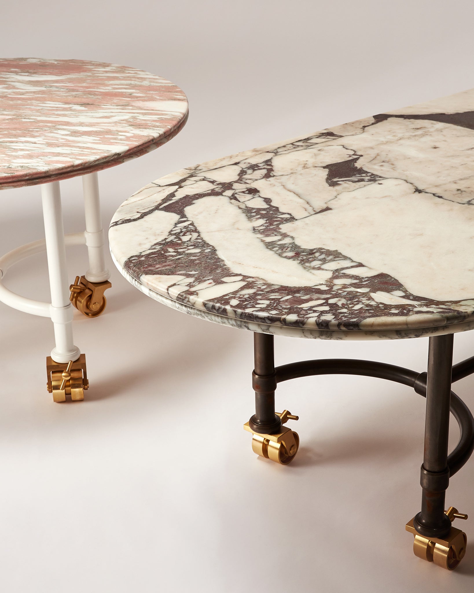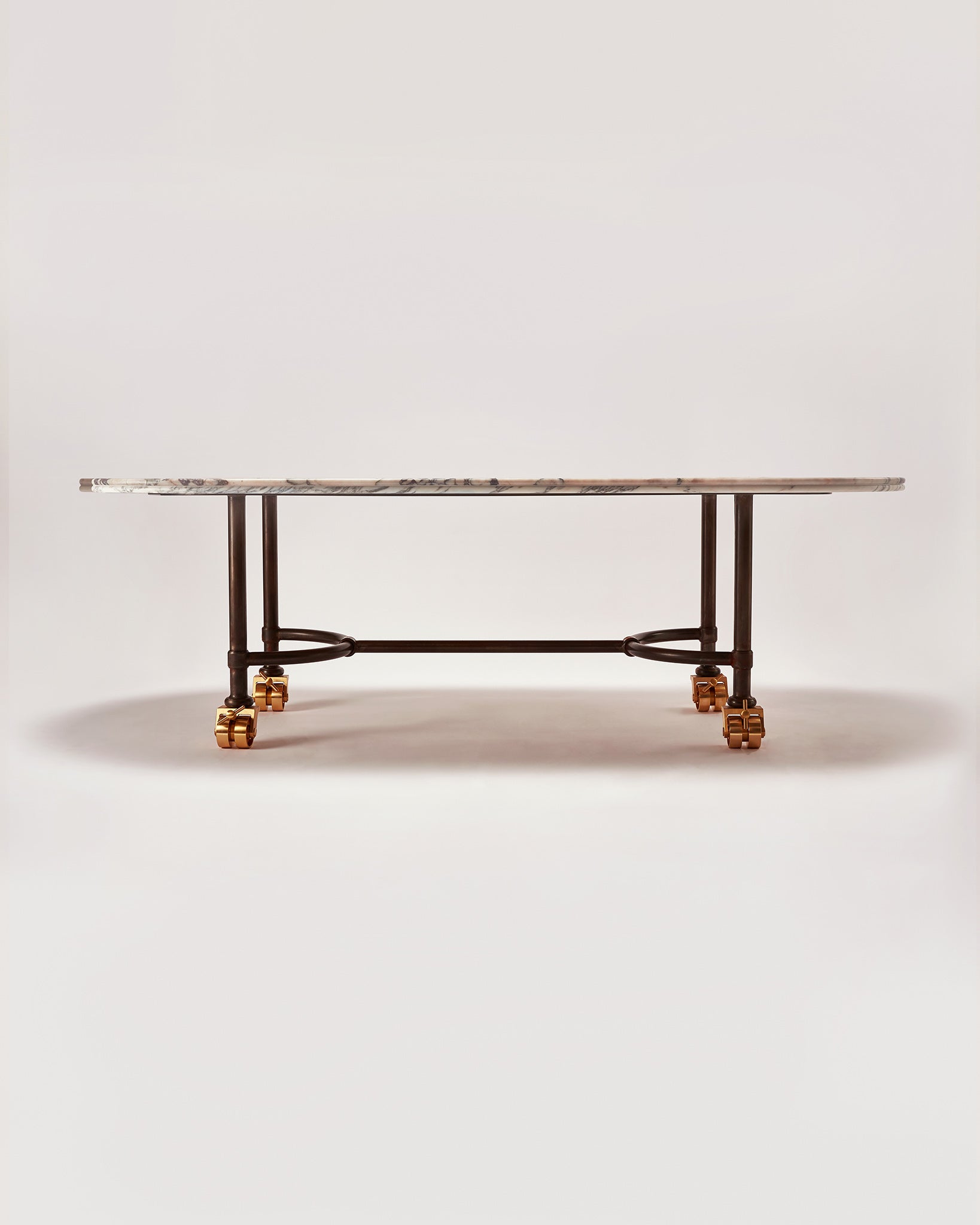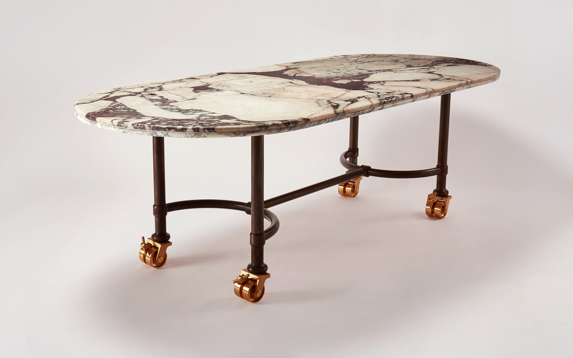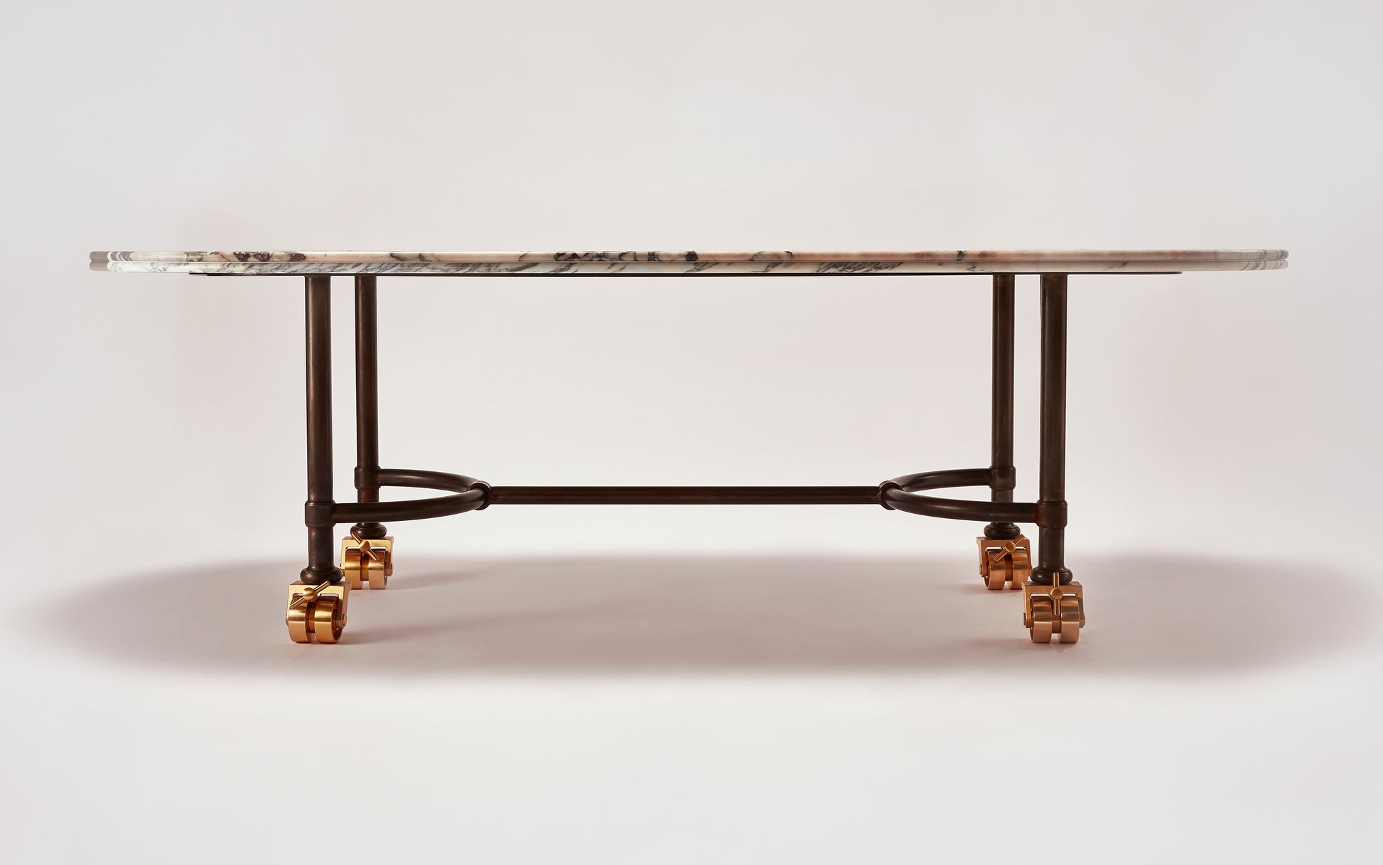 Based on a design for an early Buchanan Studio project, the Muse Table has been refined and iterated over the years and has found its way into many of the studio's interiors projects due to its versatility and the vast array of possibilities with material choices. As such, it has become the studio's ‘muse’. Available in either a circular or oval shape, made to (almost) any size, with Buchanan Studio's signature double-bullnose edge, and playful oversized solid brass wheels. The top can be produced in a wide variety of unique and rare marbles, natural stones, and travertine.