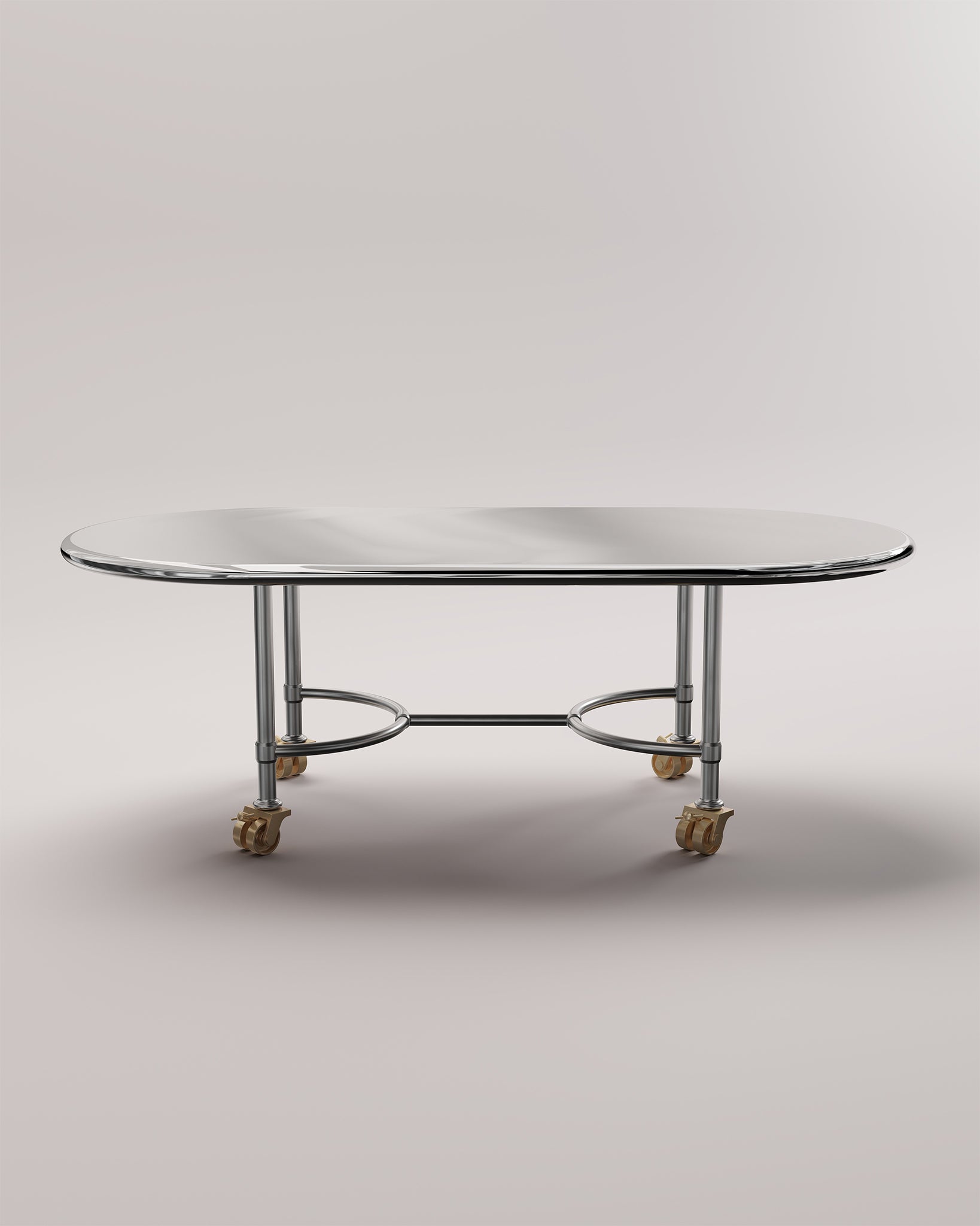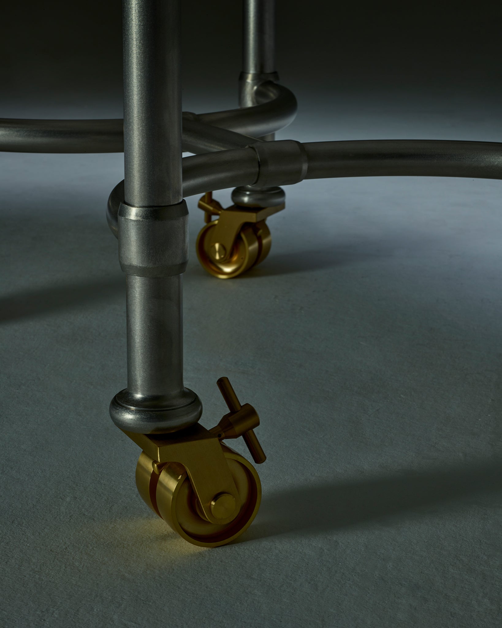 Refined and iterated over the years, the Muse Table found its name due to its versatility and the vast array of possibilities with material choices. For the Daydream Collection, the Muse Table has been created in full stainless steel; a bold reworking of the original version. Retaining its signature oversized solid brass wheels, The Daydream Muse Table preserves the original Muse Table’s iconic blend of romanticism and utilitarian design.