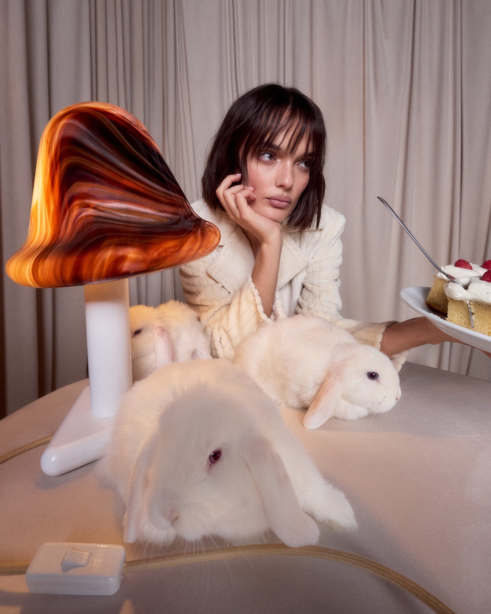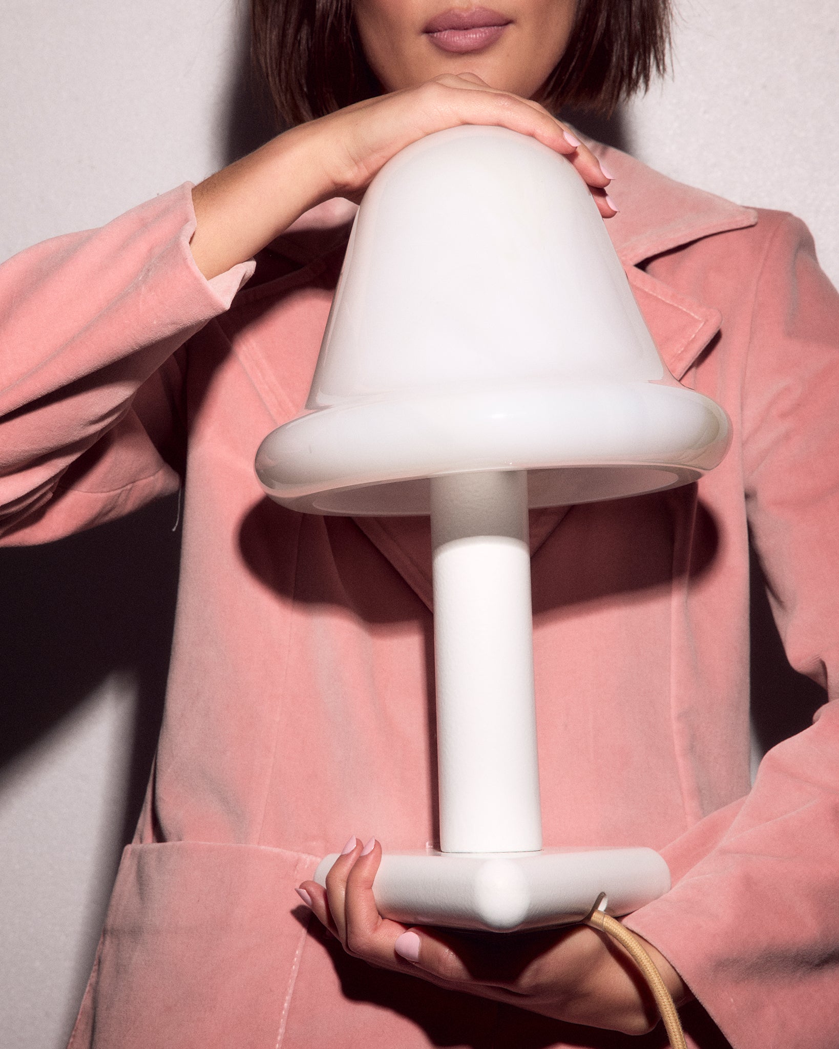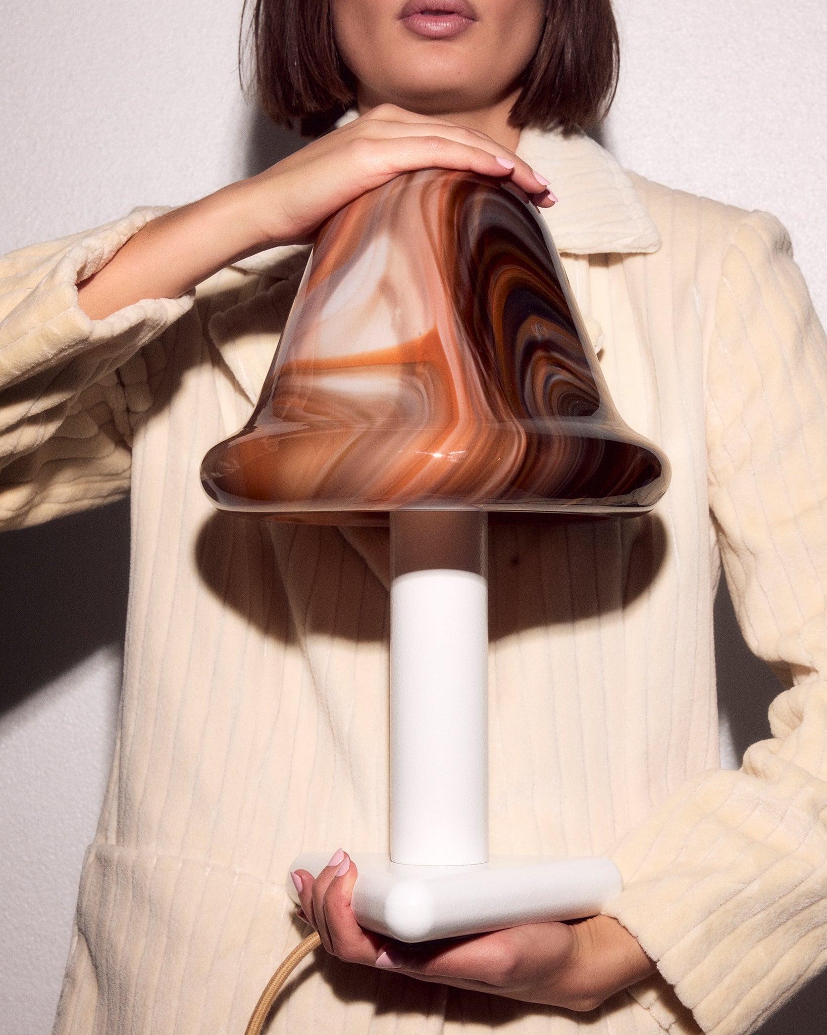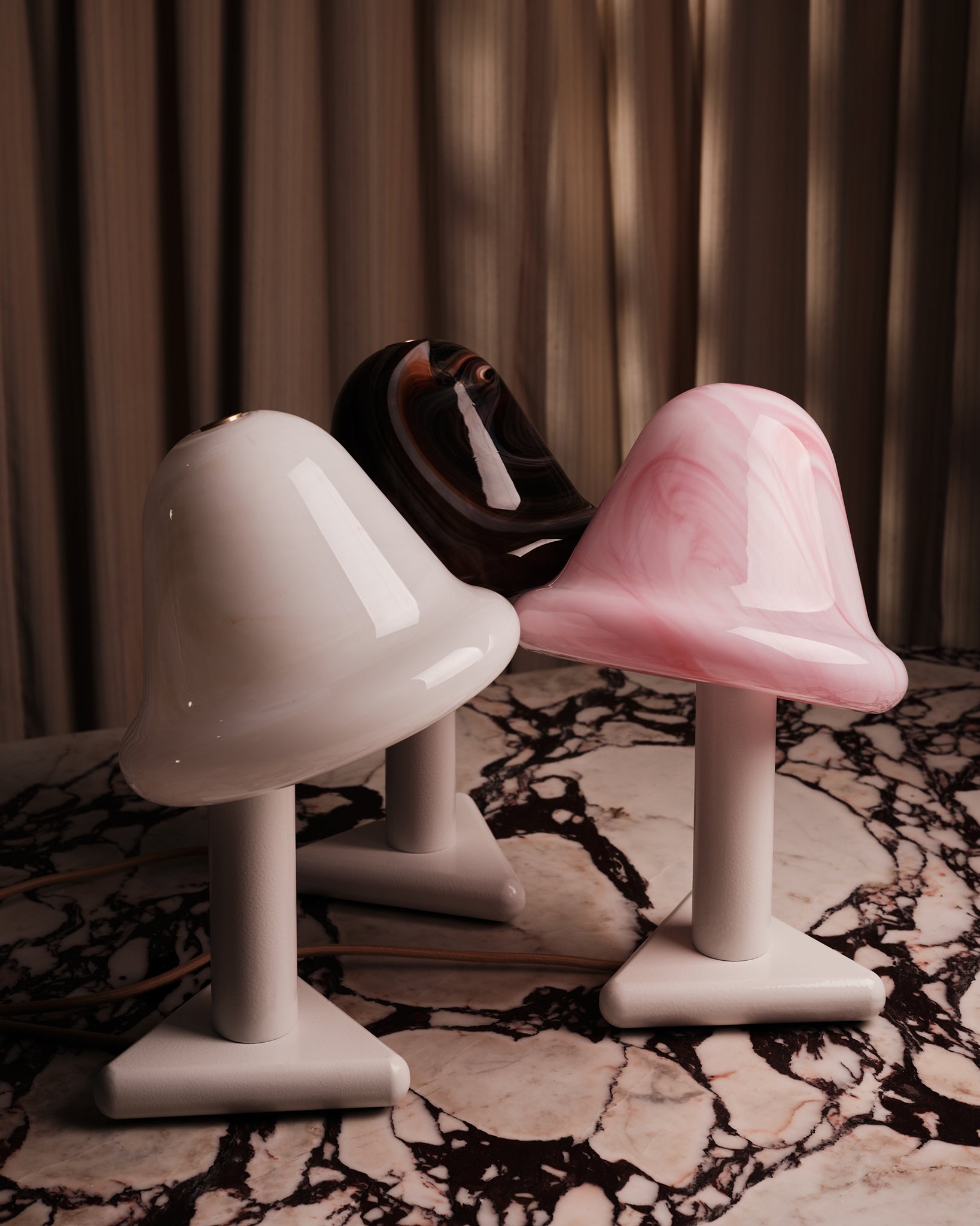 The Neo Table Light’s curvaceous bullnose shade is mouth blown in opal glass and swirled with a palette of Strawberry, Chocolate and Vanilla tones. When unlit, the swirly glass surface almost looks like delicious confectionery. When illuminated, the light transforms into a glowing pool of soft colour that brings warmth and character to any setting.
