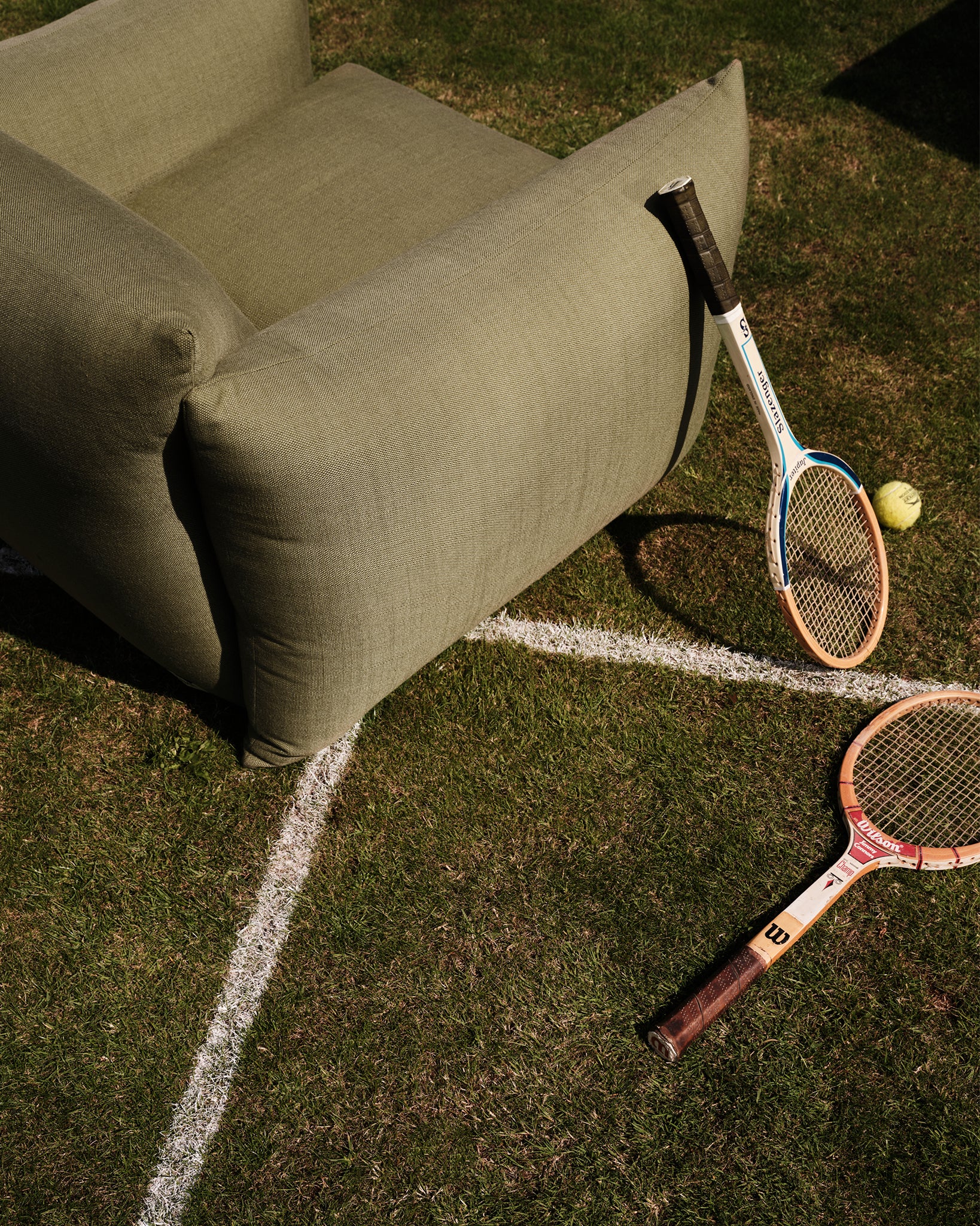 Upholstered in our Wild Plains- an indoor/outdoor performance textile, in Khaki and Chalk. Woven in Italy from 100% Trevira CS, combining design and comfort with high performance. Unlike many acrylic outdoor fabrics, Trevira offers a soft, tactile feel, reminiscent of natural yarns, making it equally suited to interiors and exteriors alike. This fabric offers water repellence, mold resistance, fade resistance, stain resistance, superior light fastness, and durability - without compromising on colour, character, or comfort.