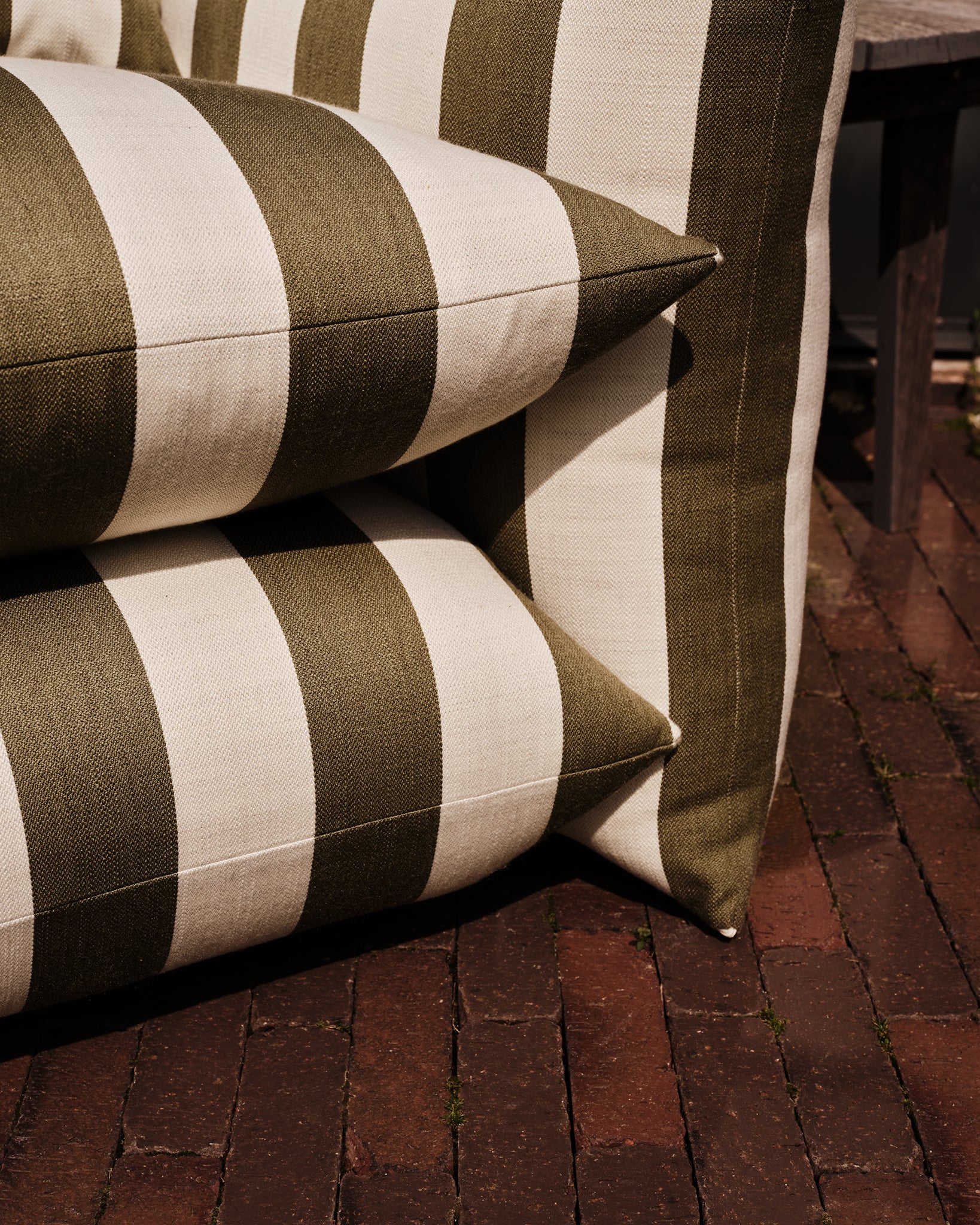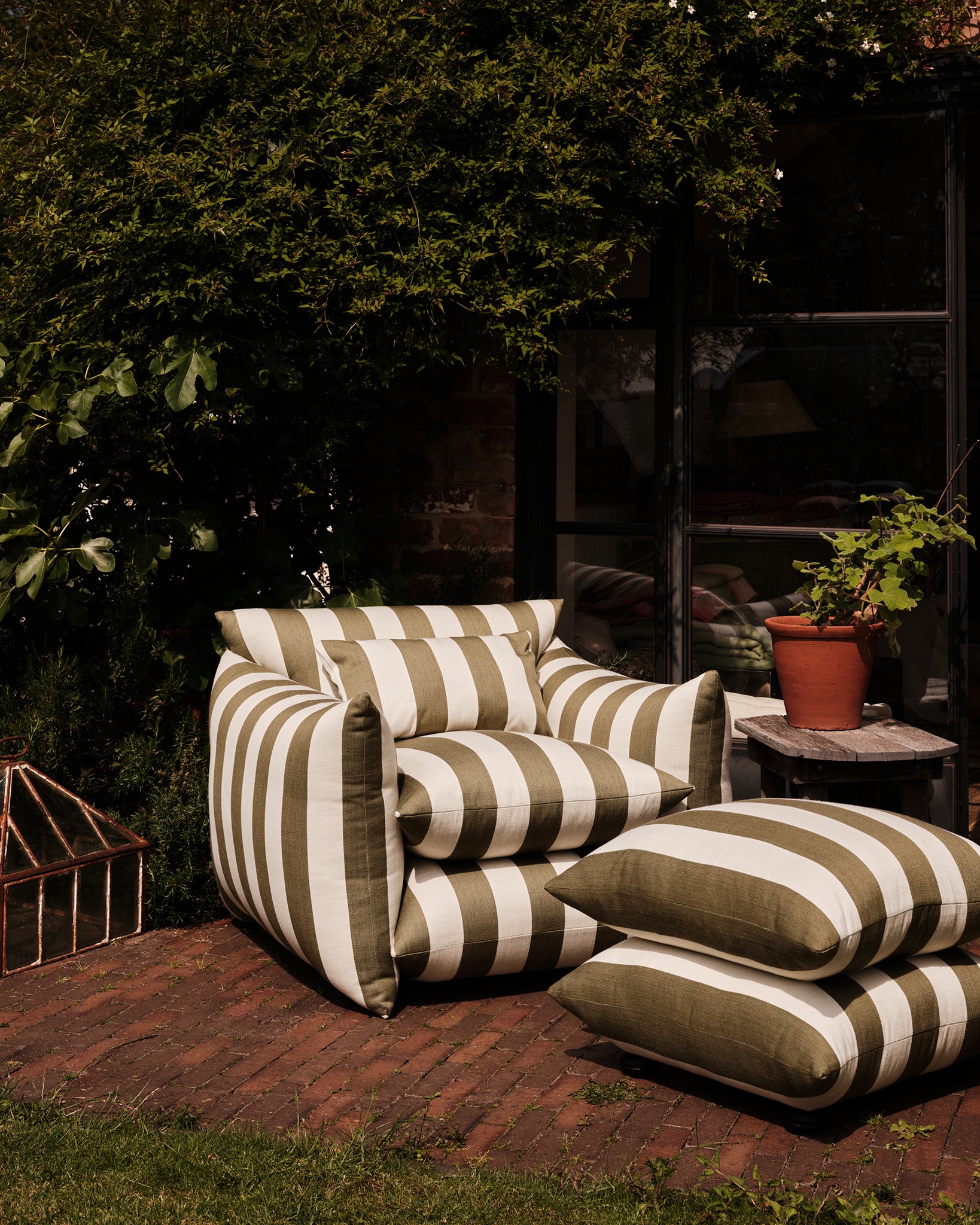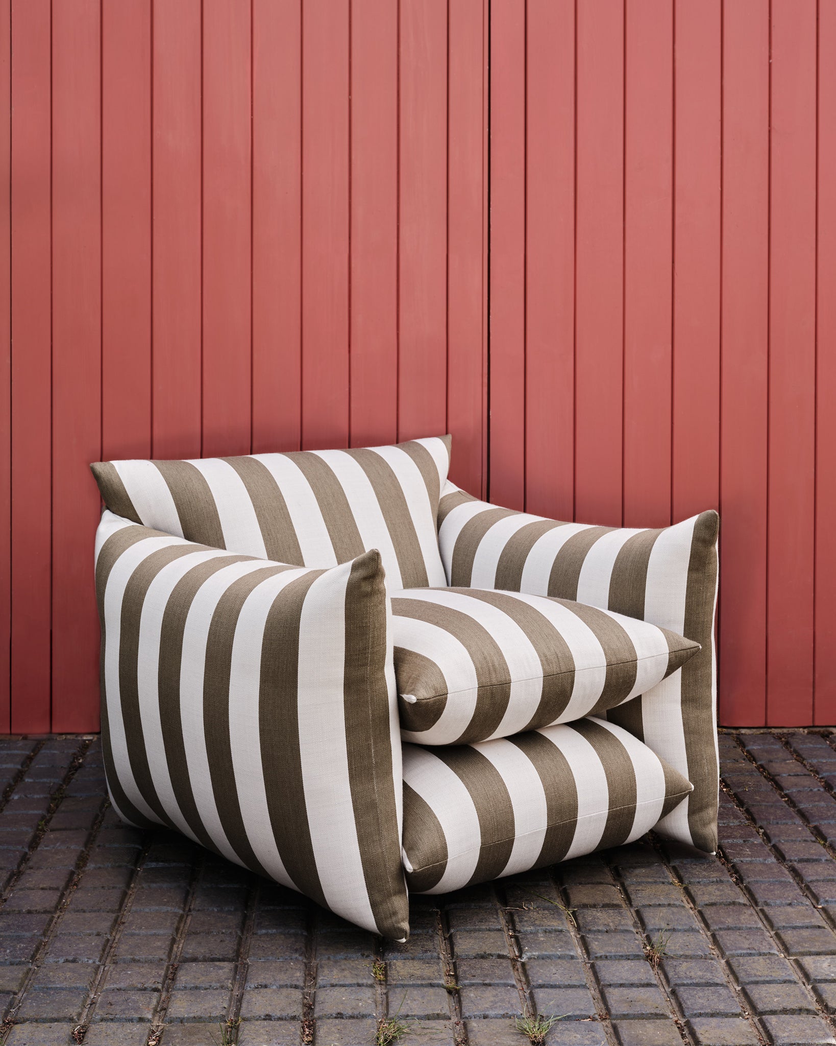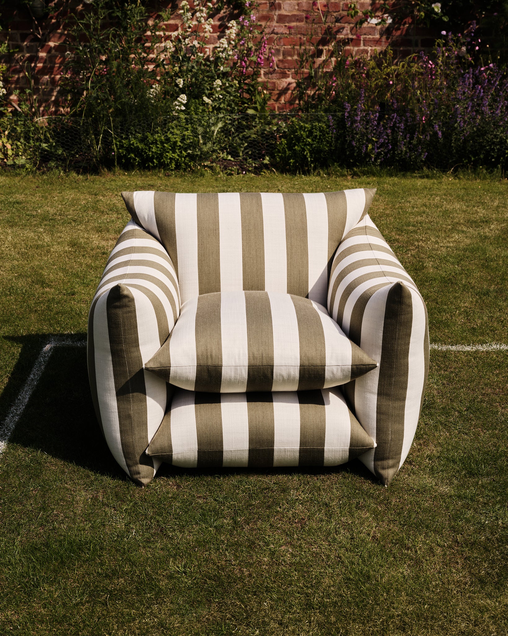 Upholstered in our Wild Studio Stripe- an indoor/outdoor performance textile, featuring our classic Studio Stripe™ in Dawn Pink, Deep Blue, and Khaki. Woven in Italy from 100% Trevira CS, combining design and comfort with high performance. Unlike many acrylic outdoor fabrics, Trevira offers a soft, tactile feel, reminiscent of natural yarns, making it equally suited to interiors and exteriors alike. This fabric offers water repellence, mold resistance, fade resistance, stain resistance, superior light fastness, and durability - without compromising on colour, character, or comfort.