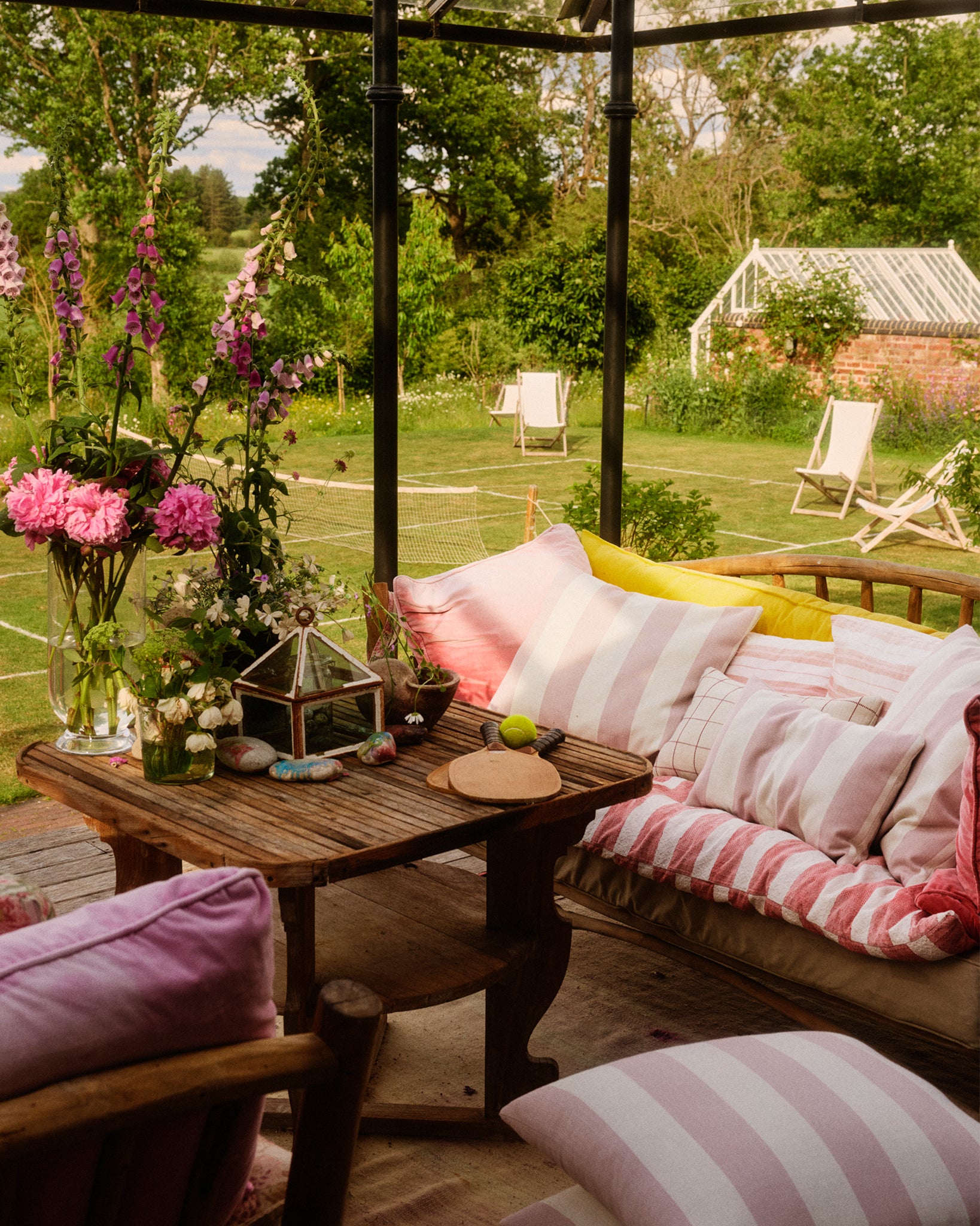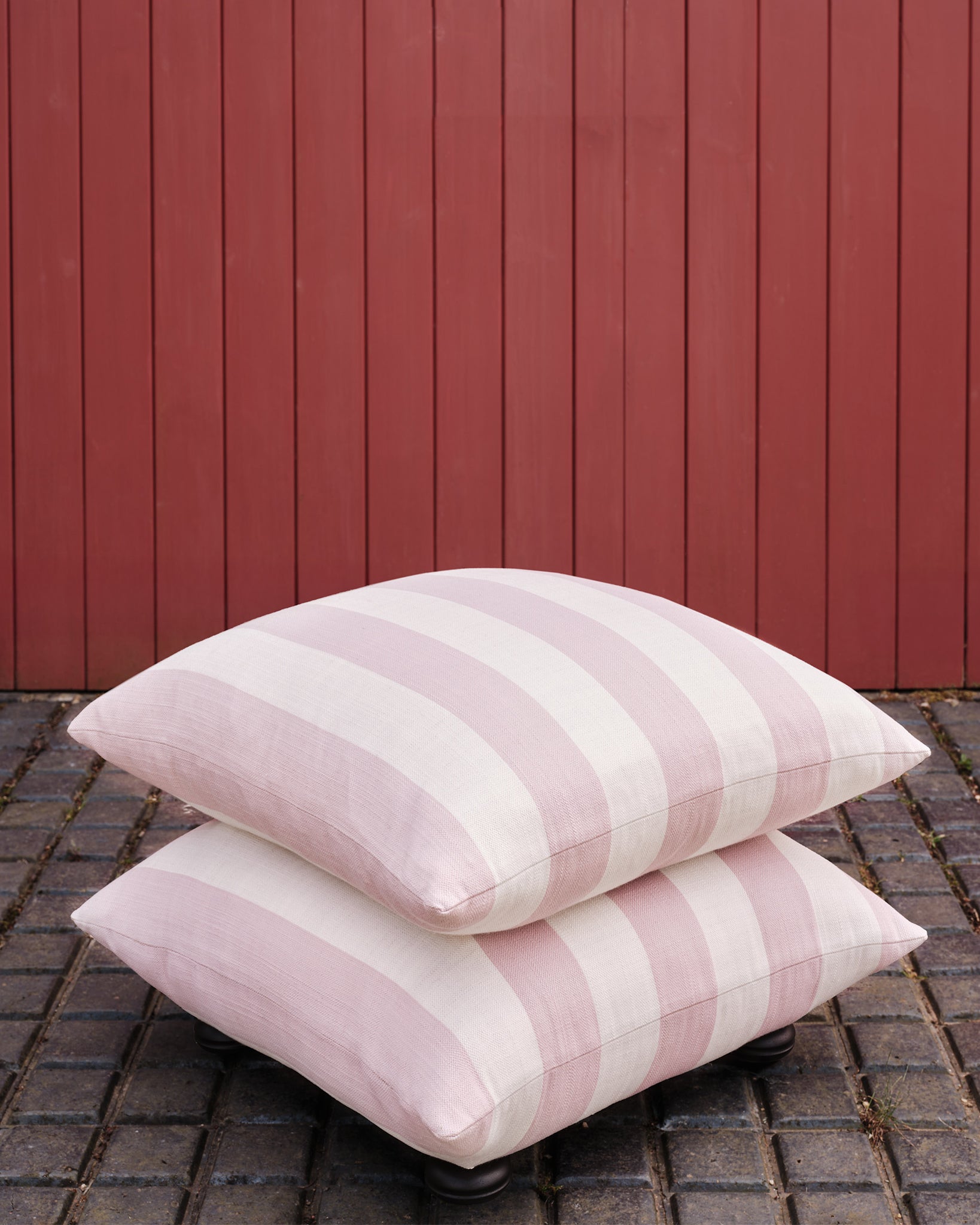Upholstered in Wild Studio Stripe- an indoor/outdoor performance textile, featuring our classic Studio Stripe™ in Dawn Pink, Deep Blue, and Khaki. Woven in Italy from 100% Trevira CS, combining design and comfort with high performance. Unlike many acrylic outdoor fabrics, Trevira offers a soft, tactile feel, reminiscent of natural yarns, making it equally suited to interiors and exteriors alike. This fabric offers water repellence, mold resistance, fade resistance, stain resistance, superior light fastness, and durability - without compromising on colour, character, or comfort.