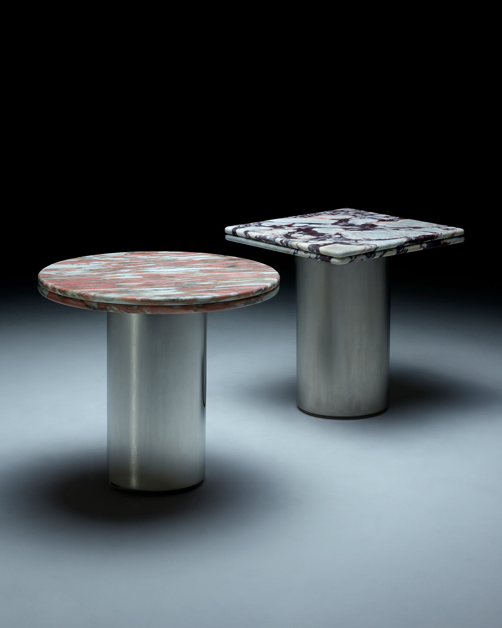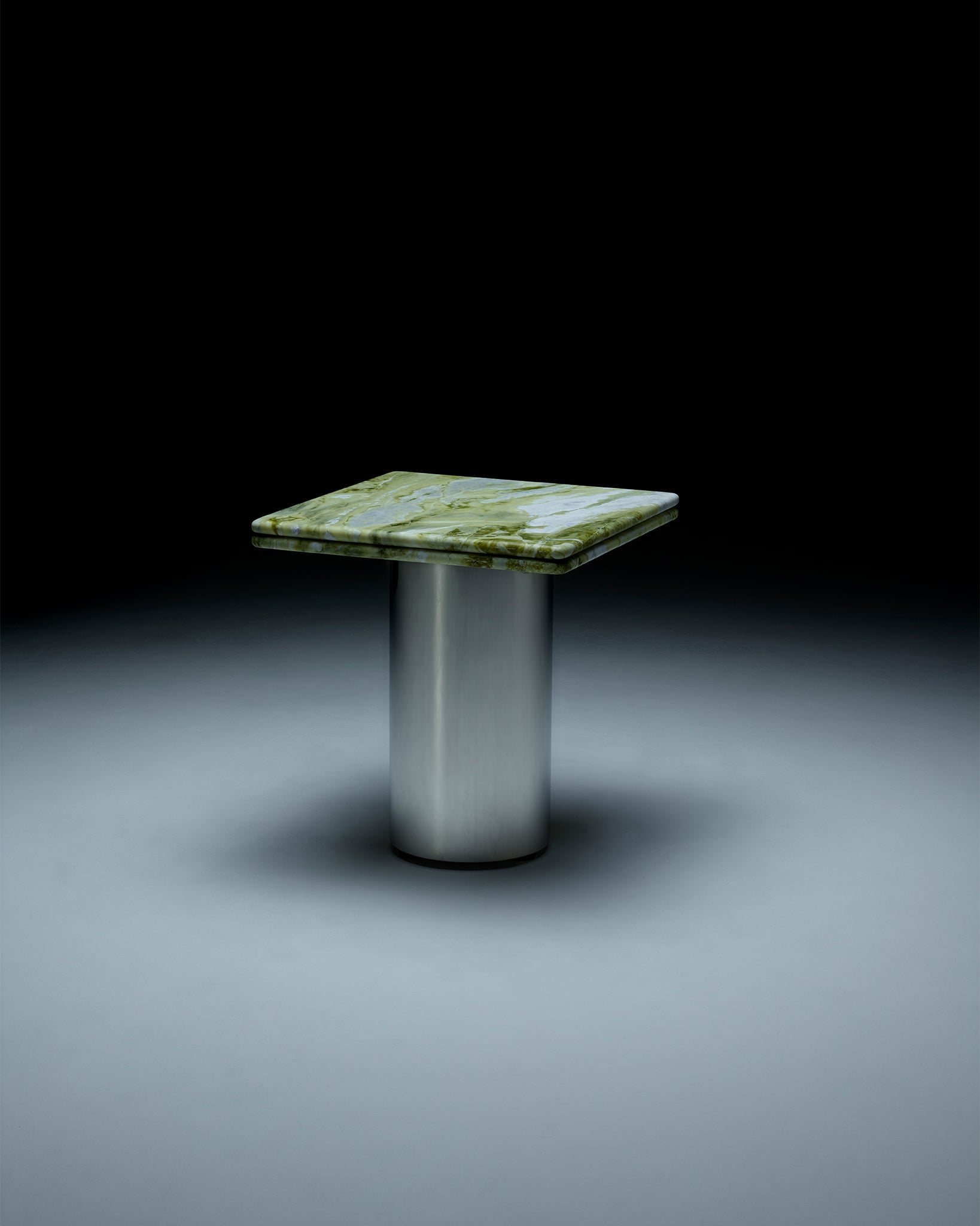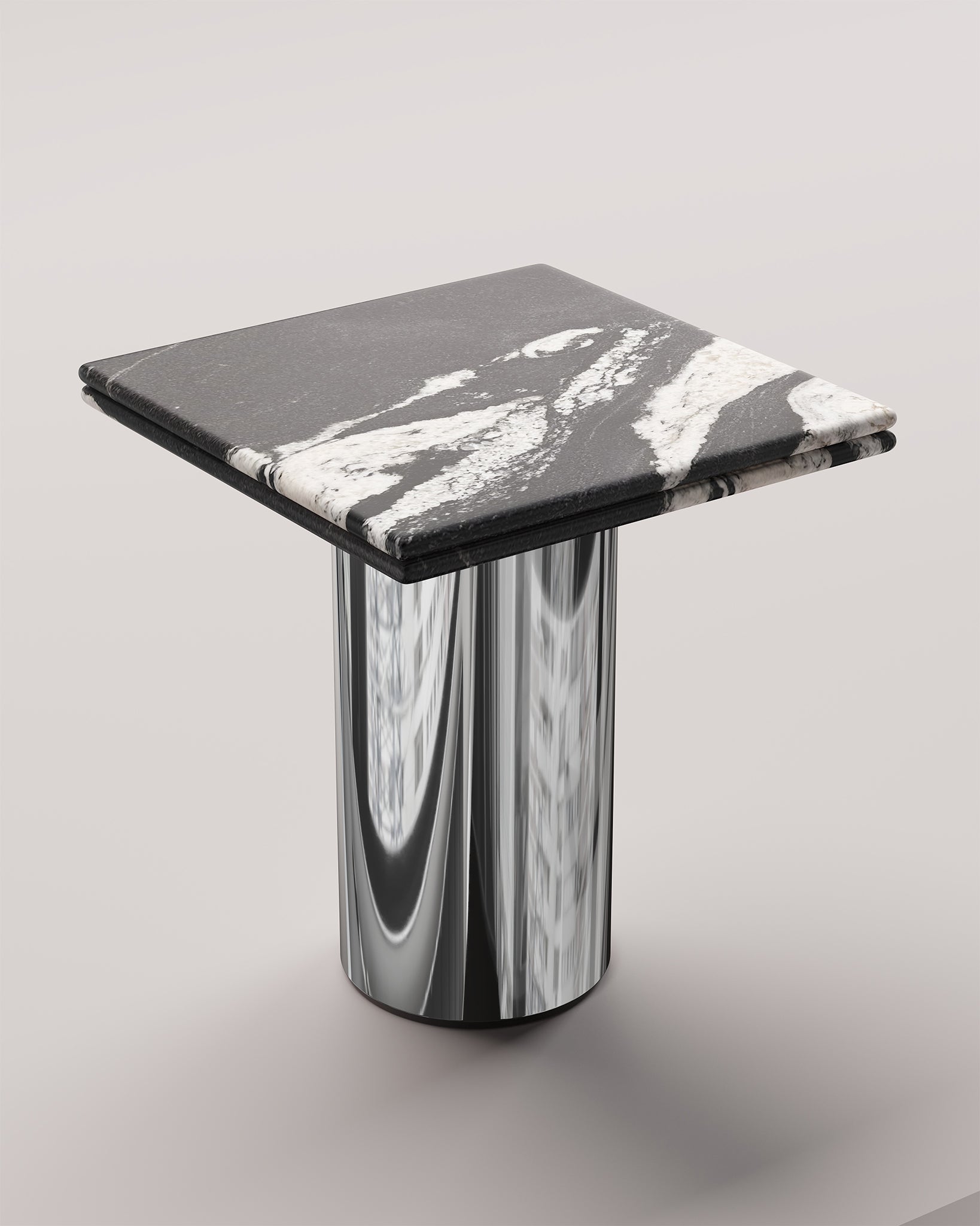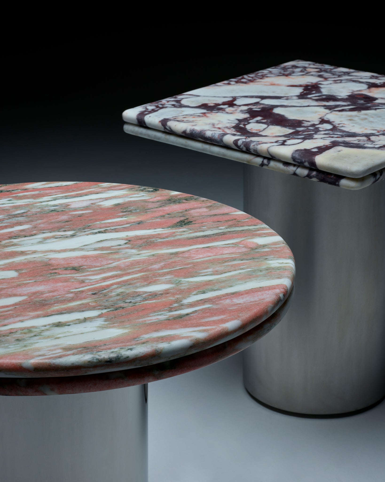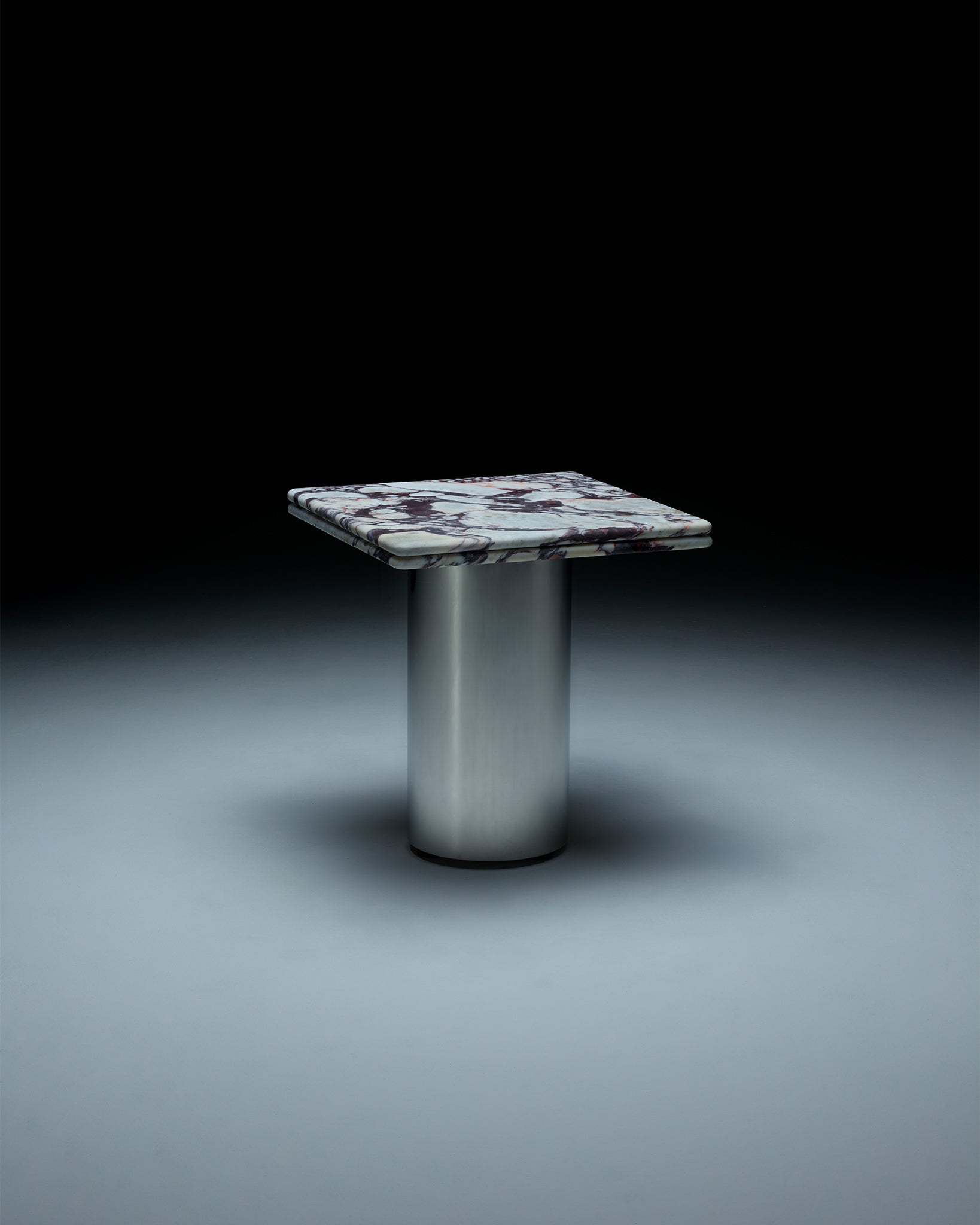 A versatile side table that brings Buchanan Studio's signature edge to any space. Available in three geometric shapes- square, circle and triangle - with top options in three of the studio's favourite marbles, Norweigan Rose, Black Horse and Calacatta Viola. Effortlessly combining form and function, the triangular version of the Shape Table was conceived to perfectly fit between the often awkward gap between two armchairs. The cylindrical base of each piece is hand crafted in England from Stainless Steel with a mirror polish finish.