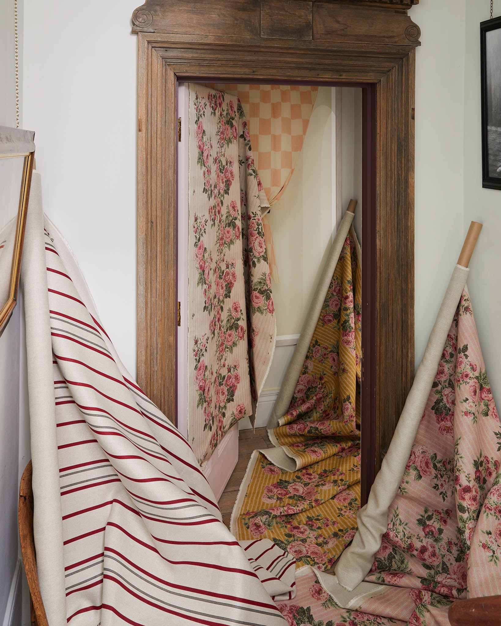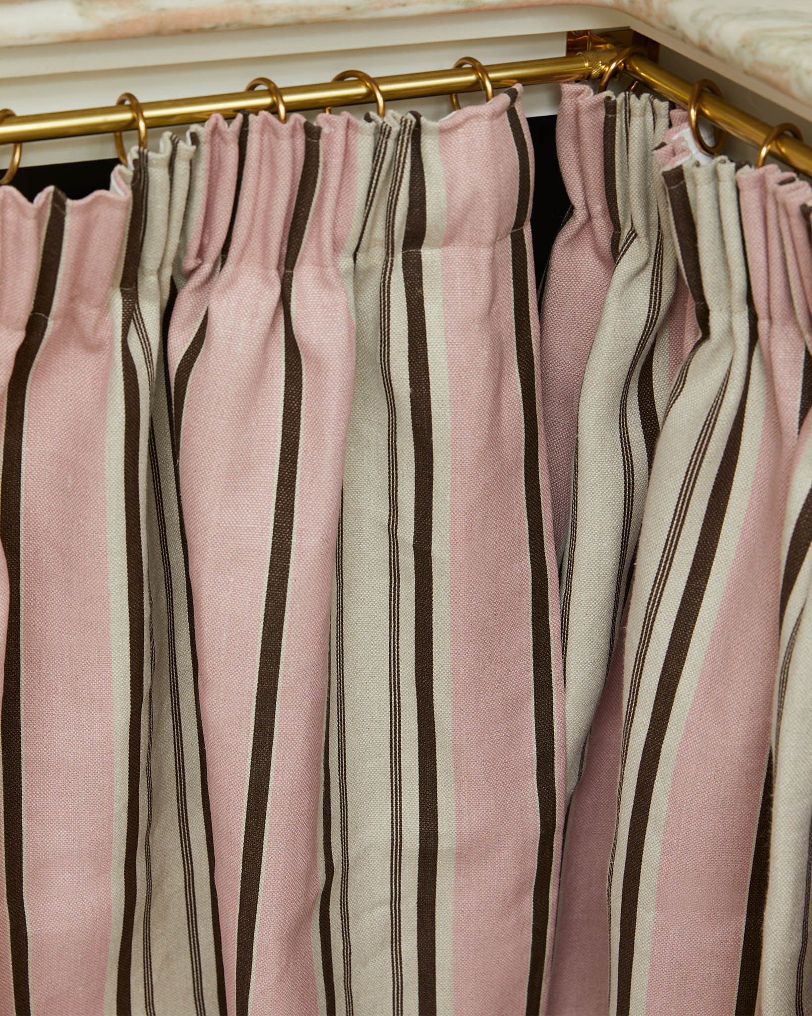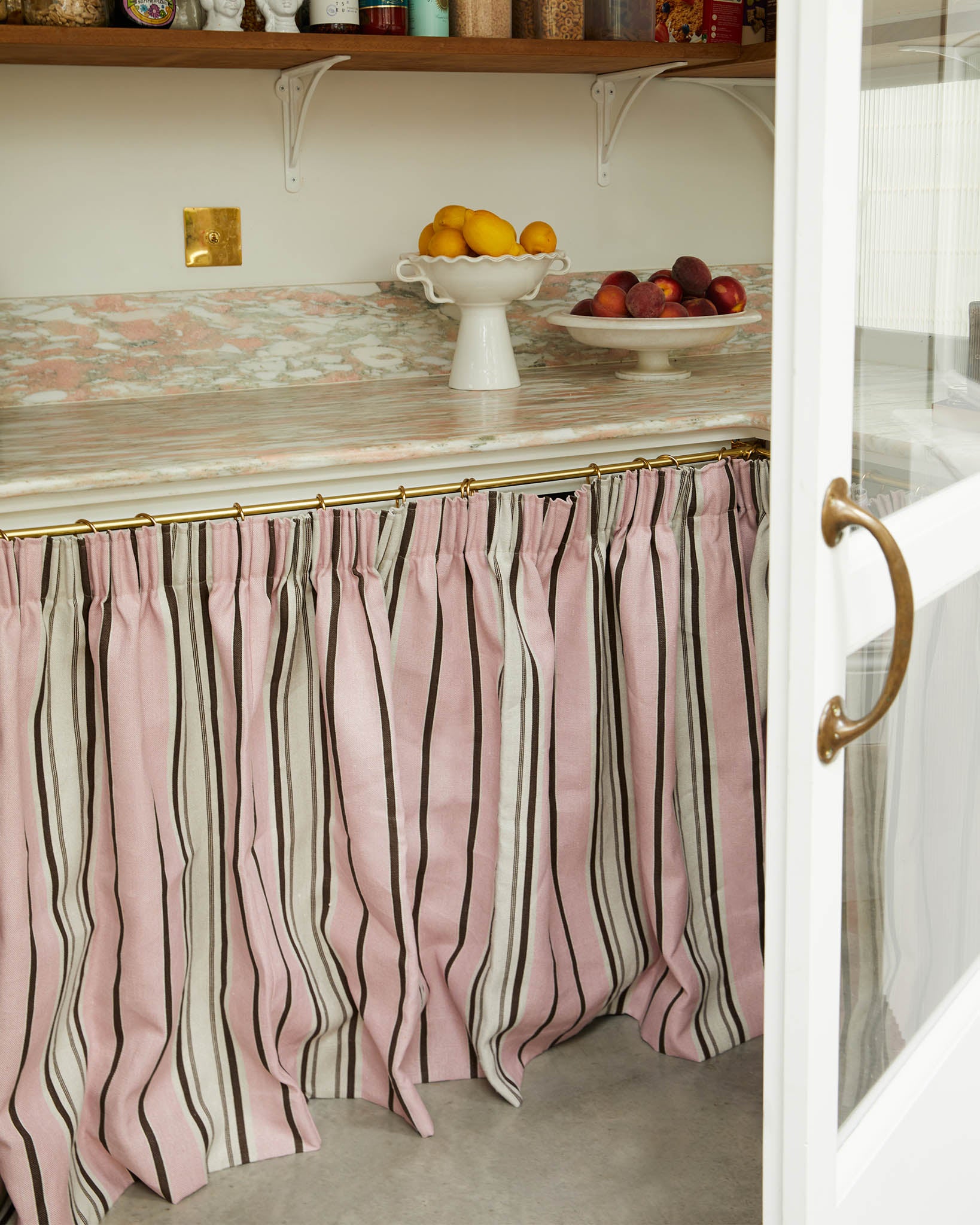 'Ochre' is a combination of golden yellow and pale pink, grounded by a rich chocolate brown, it was inspired by the colour palette in Angus and Charlotte's stripy "batternberg" bathroon at home.