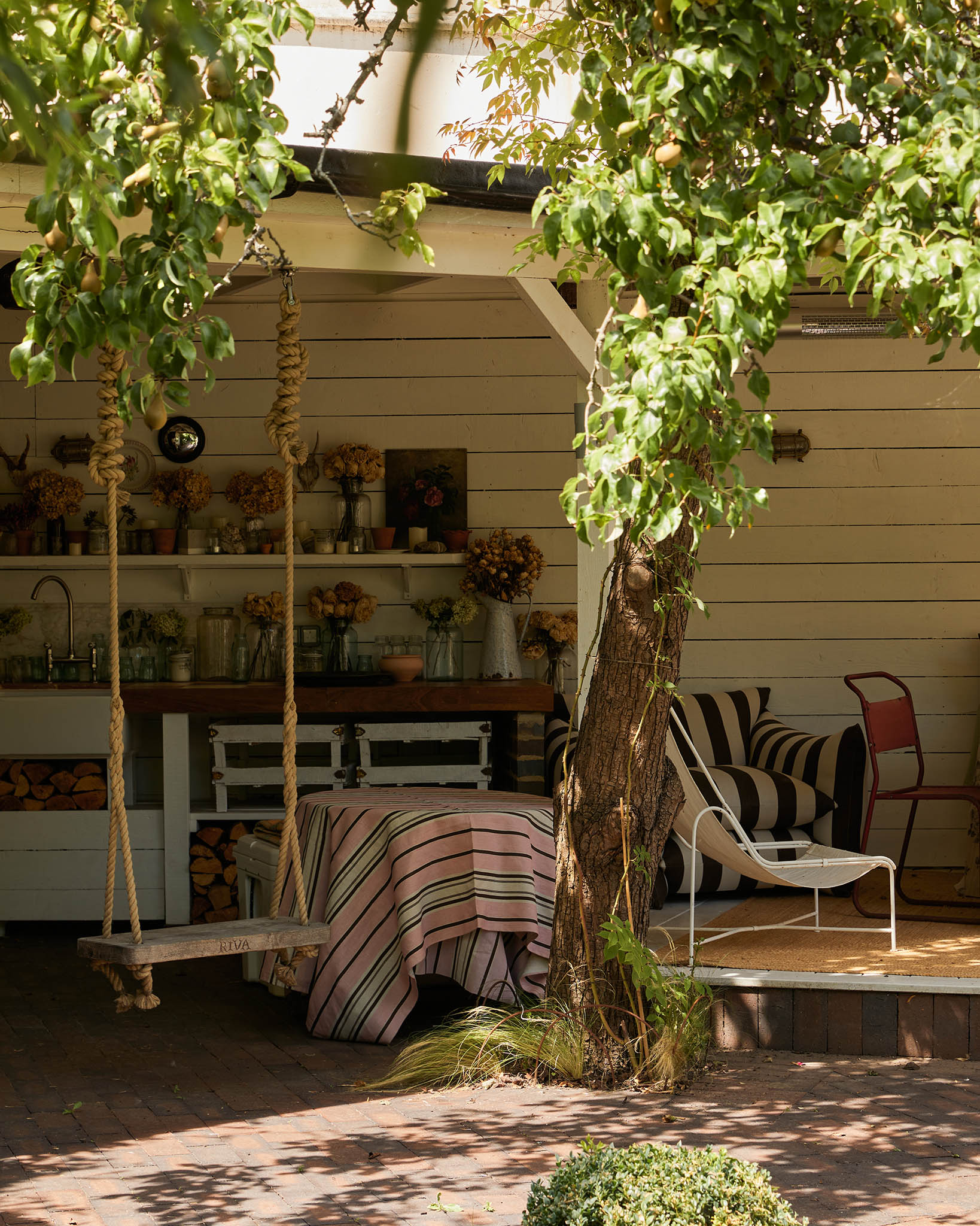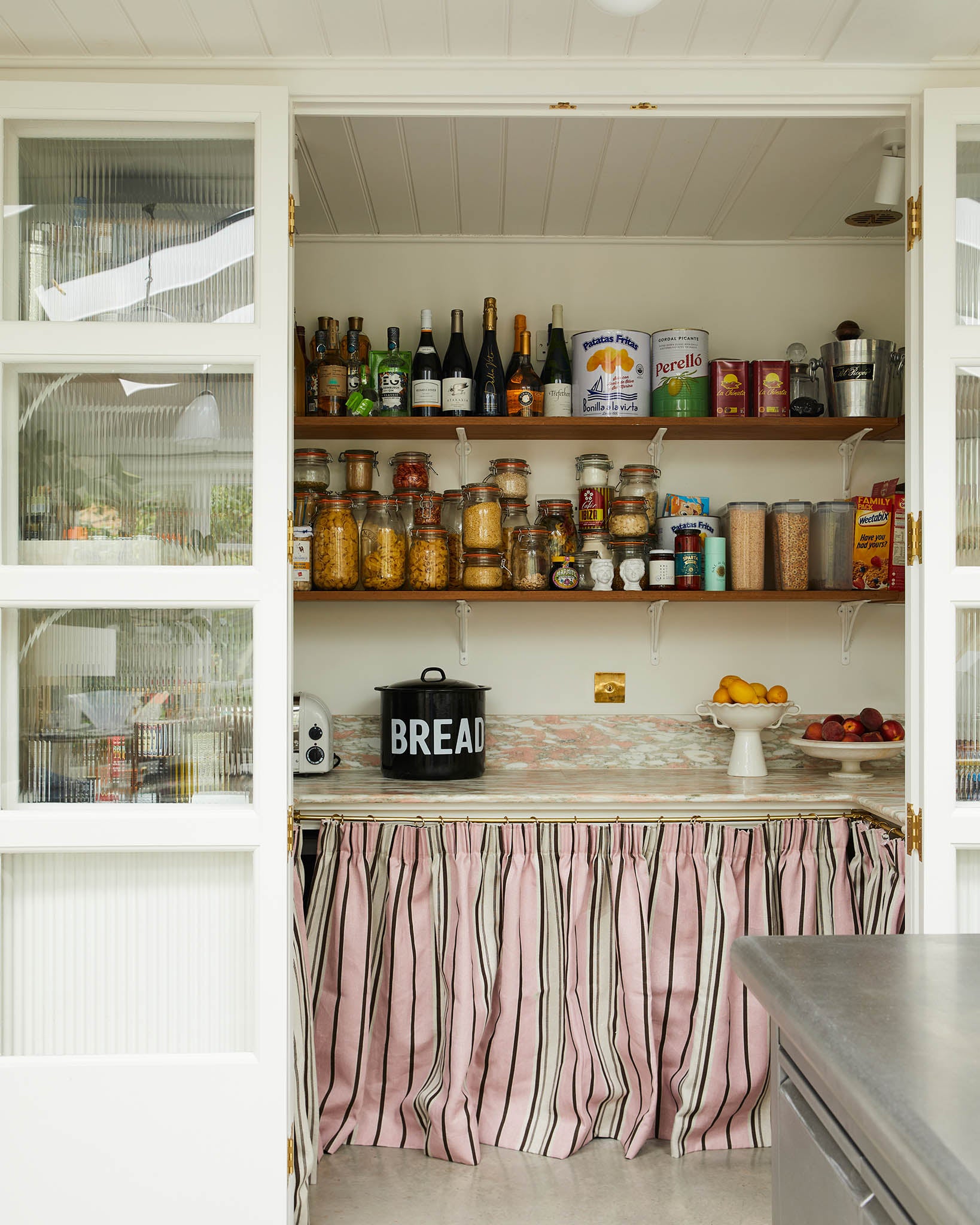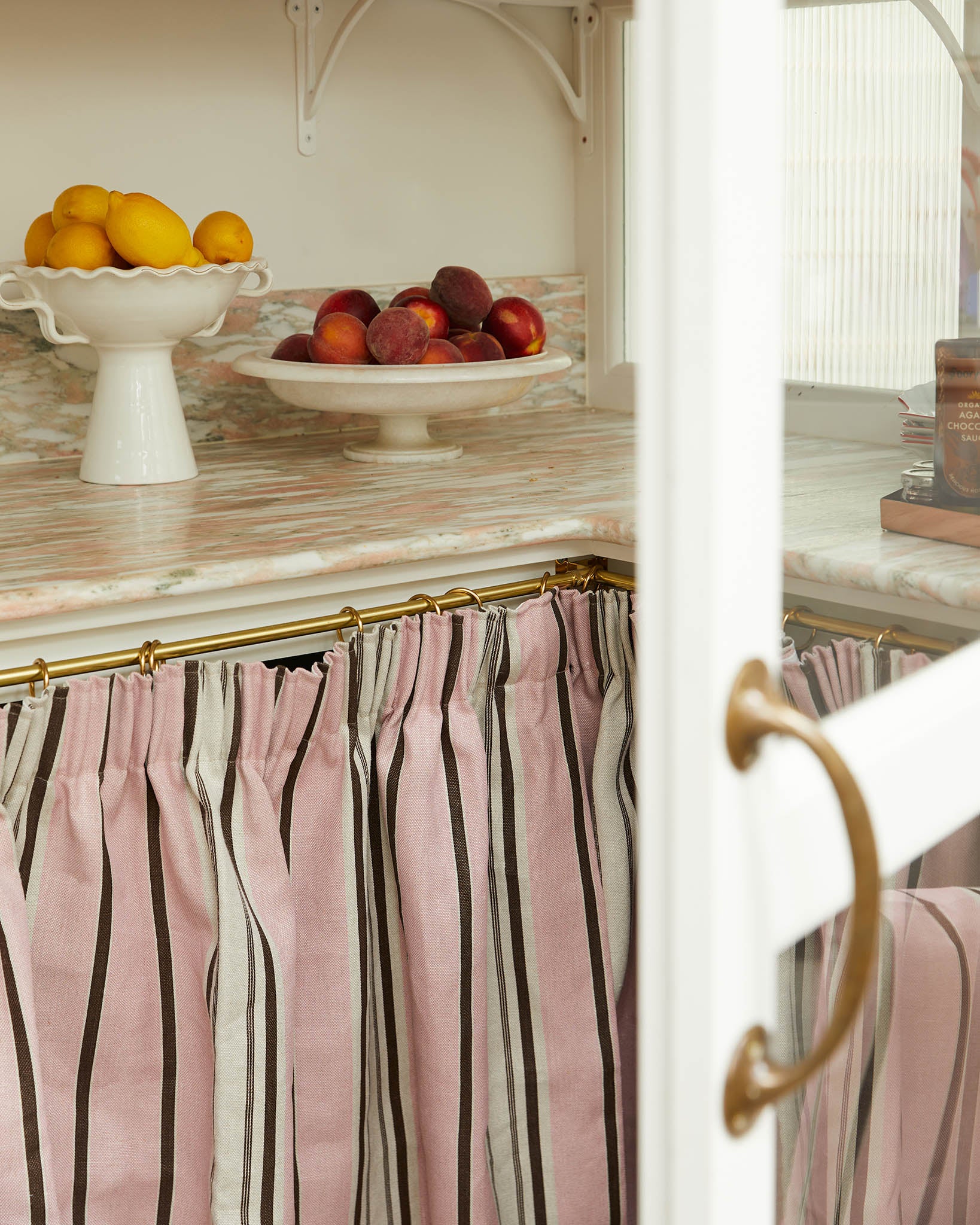 'Ochre' is a combination of golden yellow and pale pink, grounded by a rich chocolate brown, it was inspired by the colour palette in Angus and Charlotte's stripy "batternberg" bathroon at home.