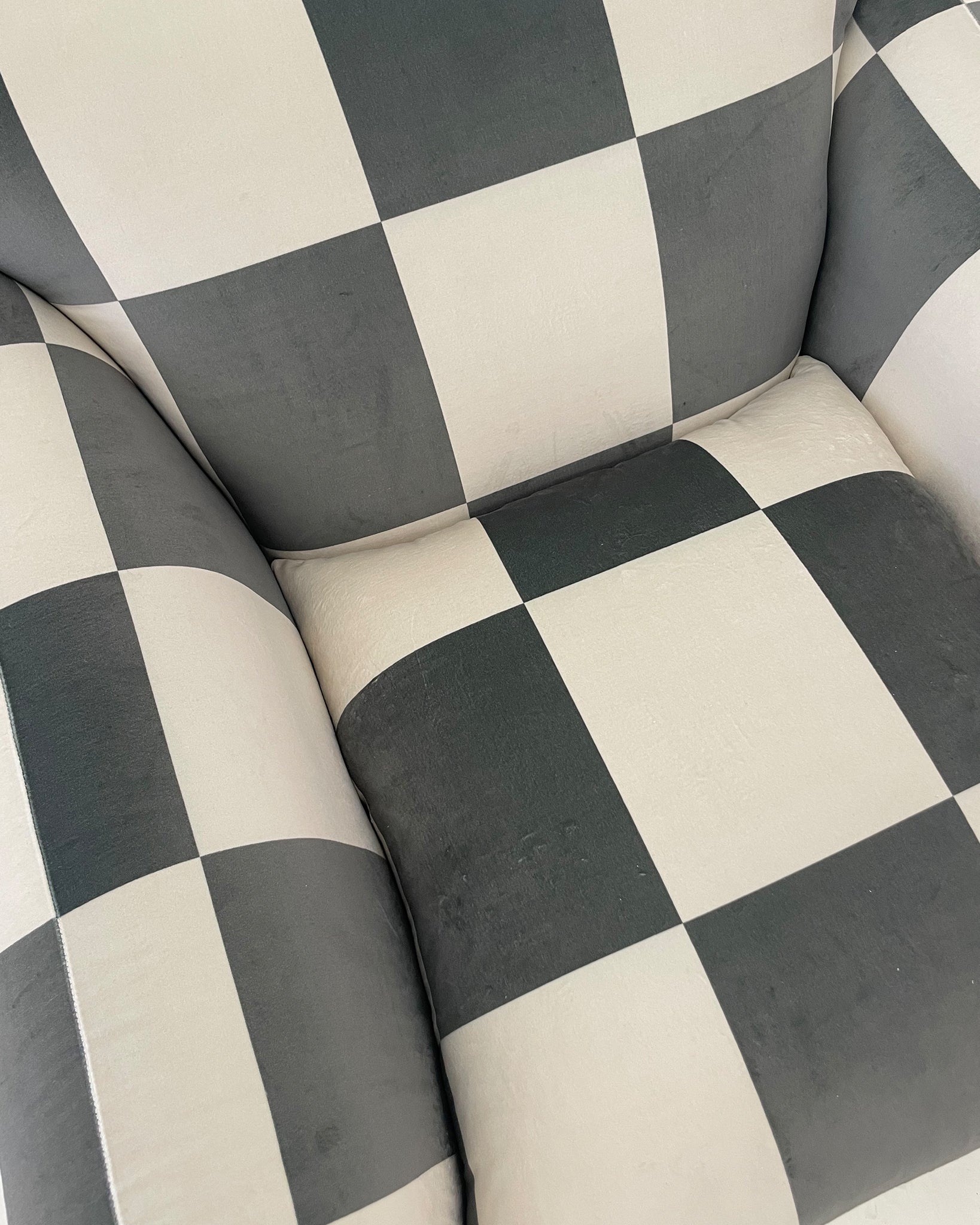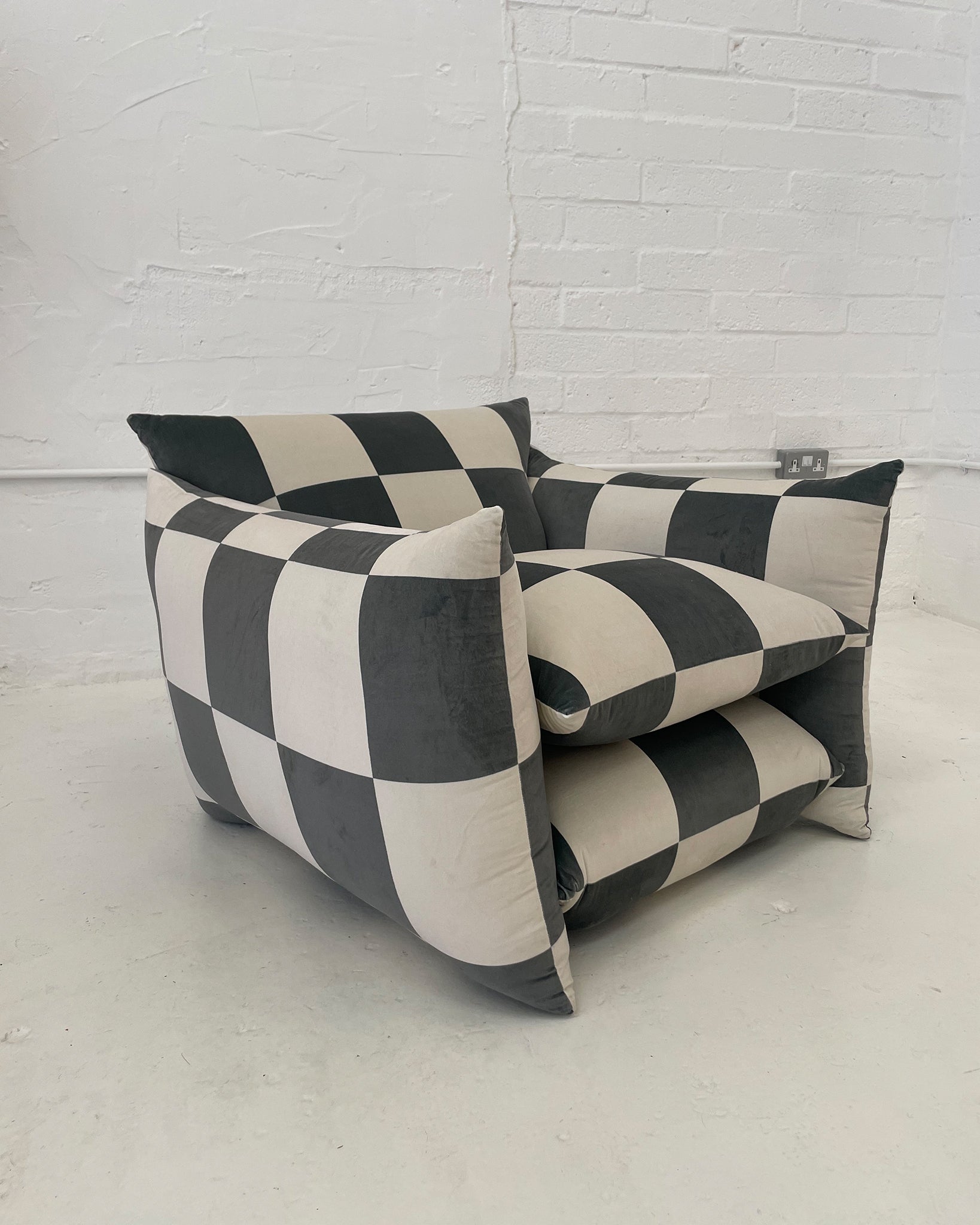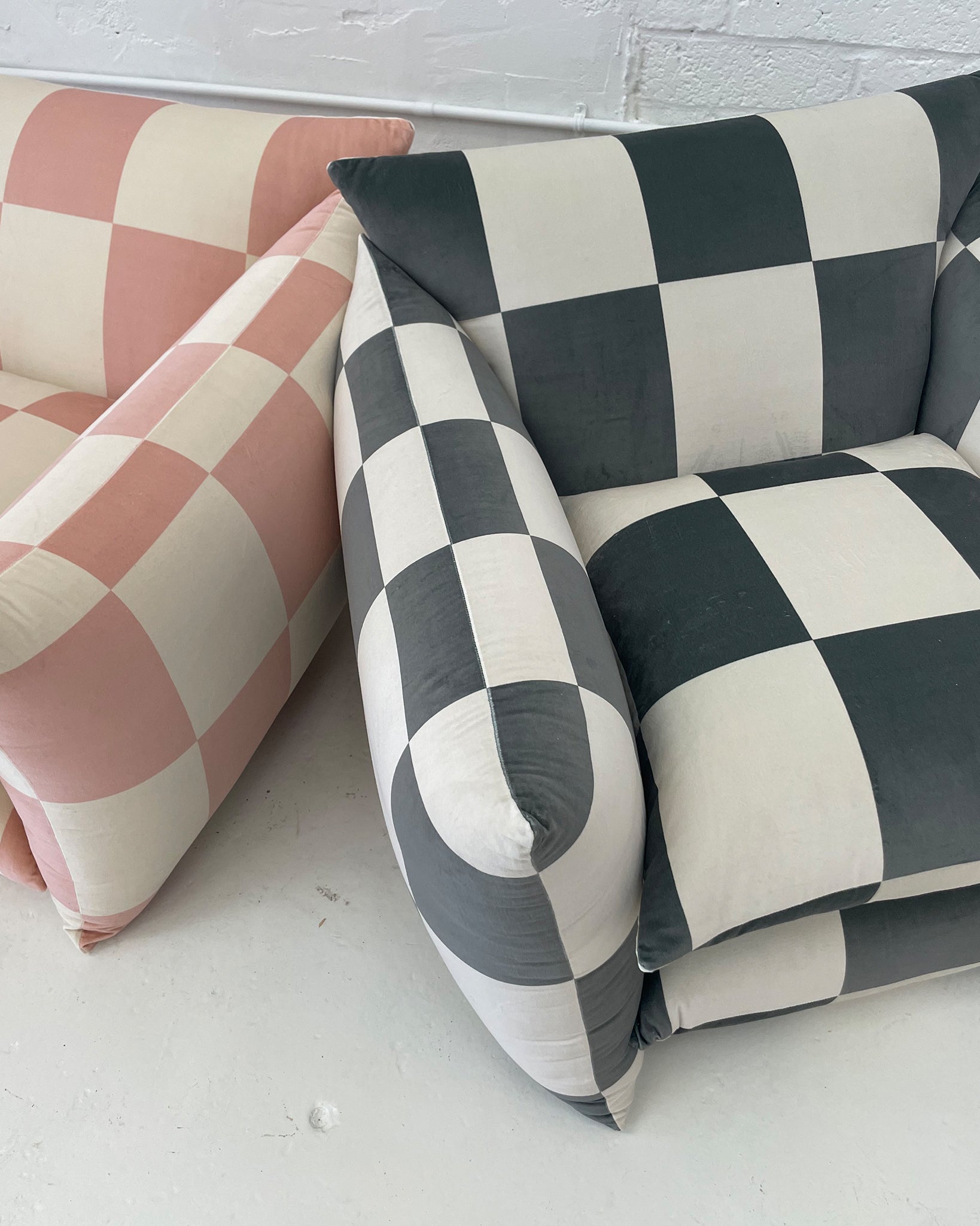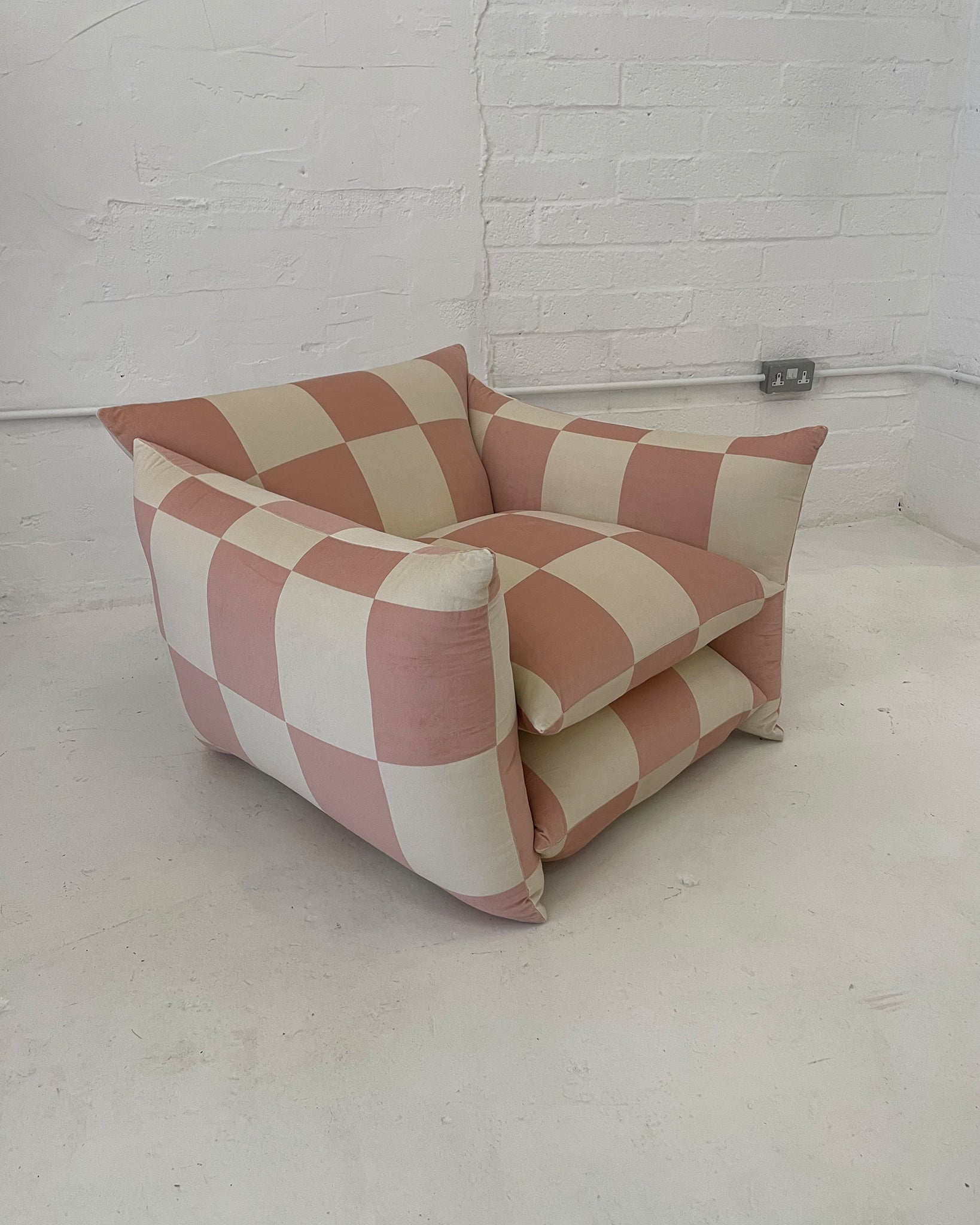 Inspired by the soft geometric shapes and fluid forms of 1970's furniture, the Studio Chair captures the essence of the free flowing and imaginative designs of the era whilst also feeling firmly rooted in the present. Designed with the aim of uniting expert craftsmanship and a strong aesthetic, the Studio Chair combines generous proportions with curved edges and bold design, giving the illusion of five cushions "floating" together, despite its sturdy frame. Expertly handmade in England using traditional techniques, upholstered in our soft cotton velvet 'Checkmate' in either Peony or Sage.