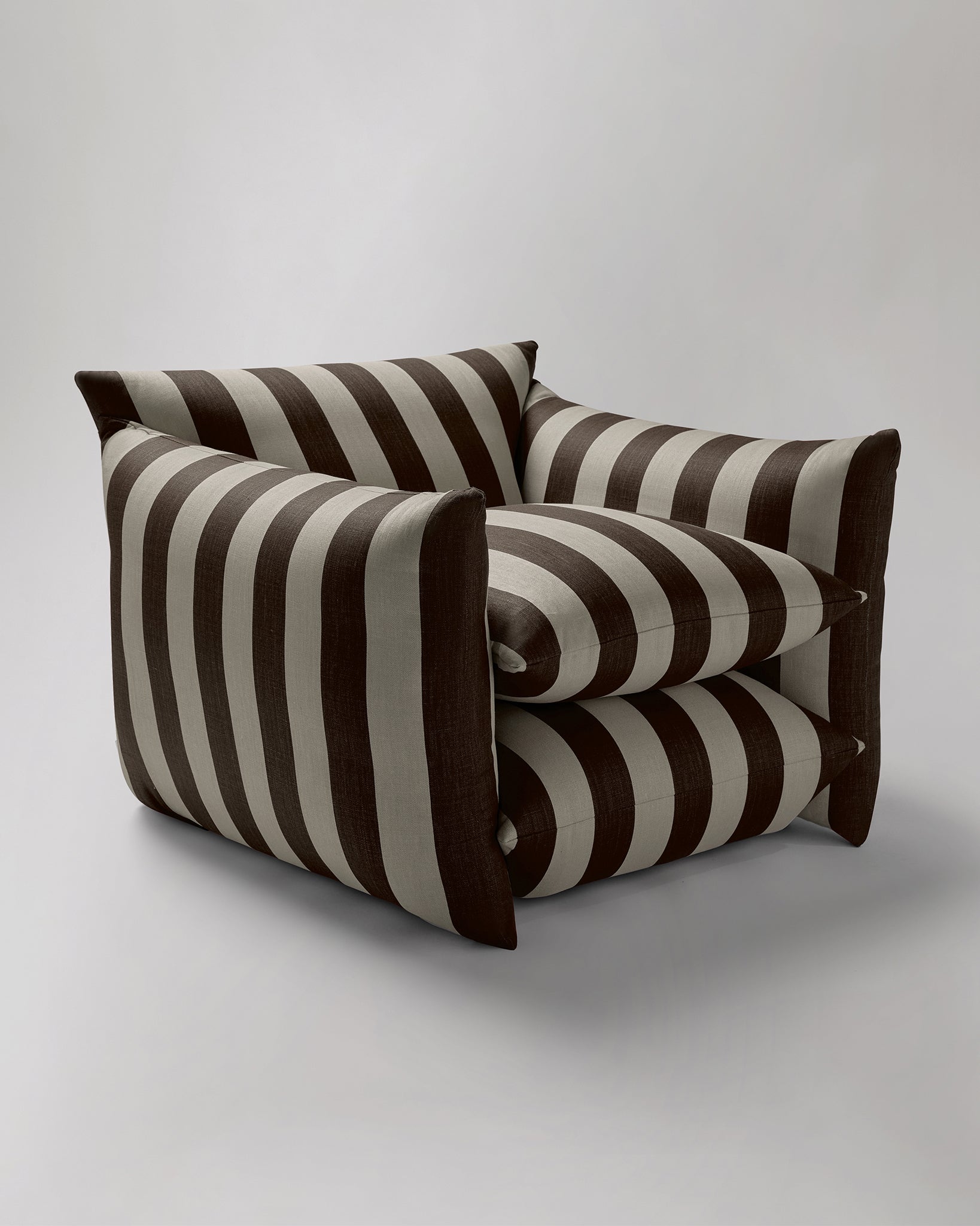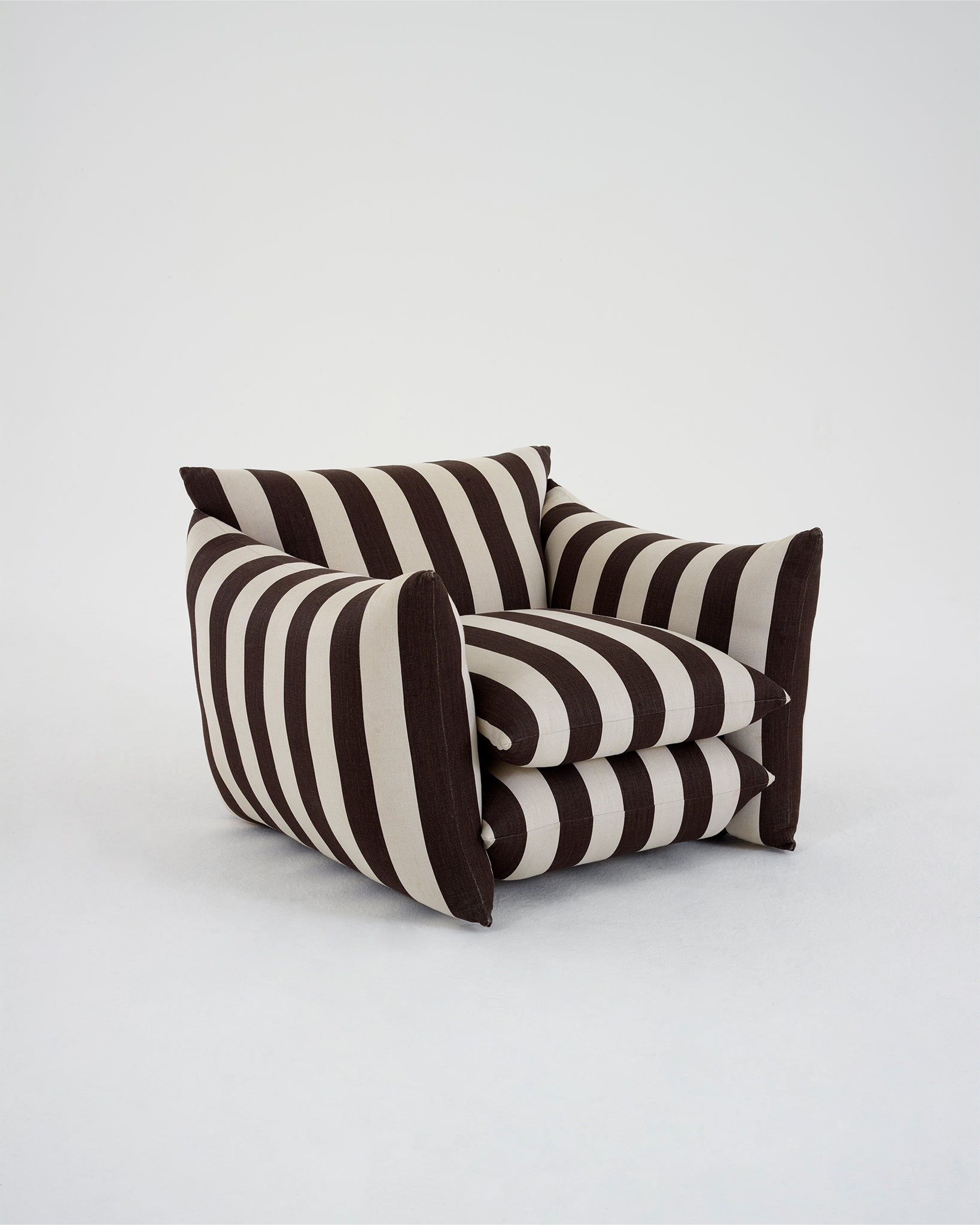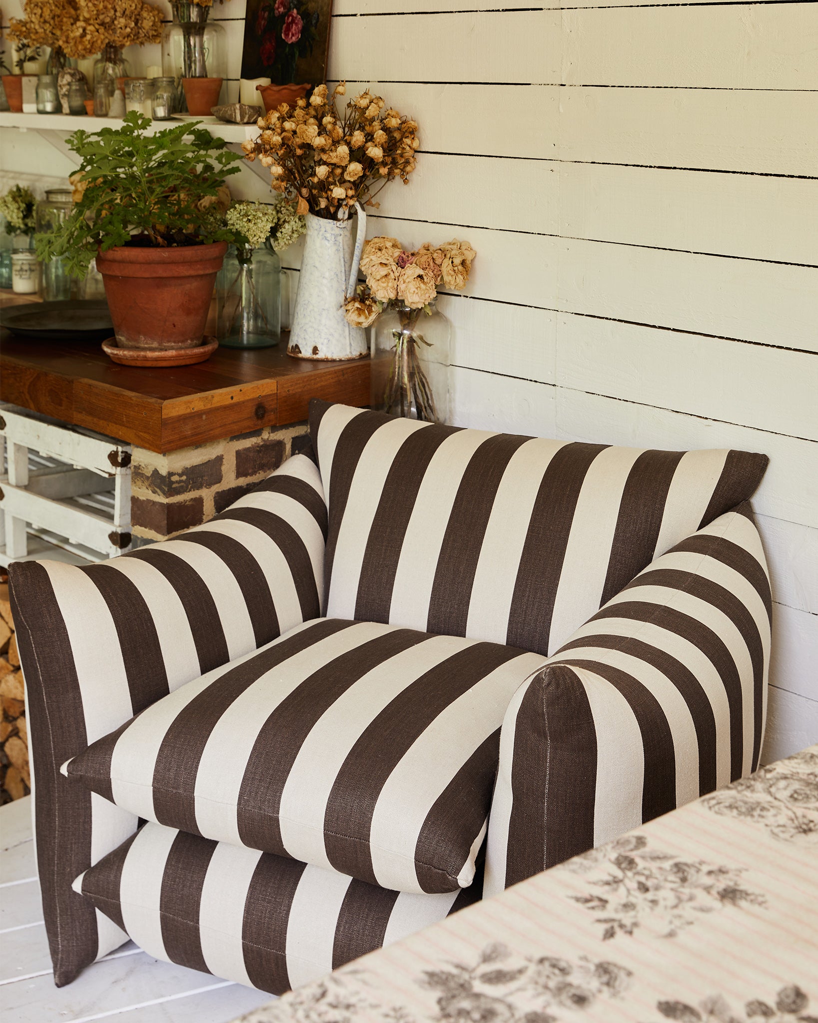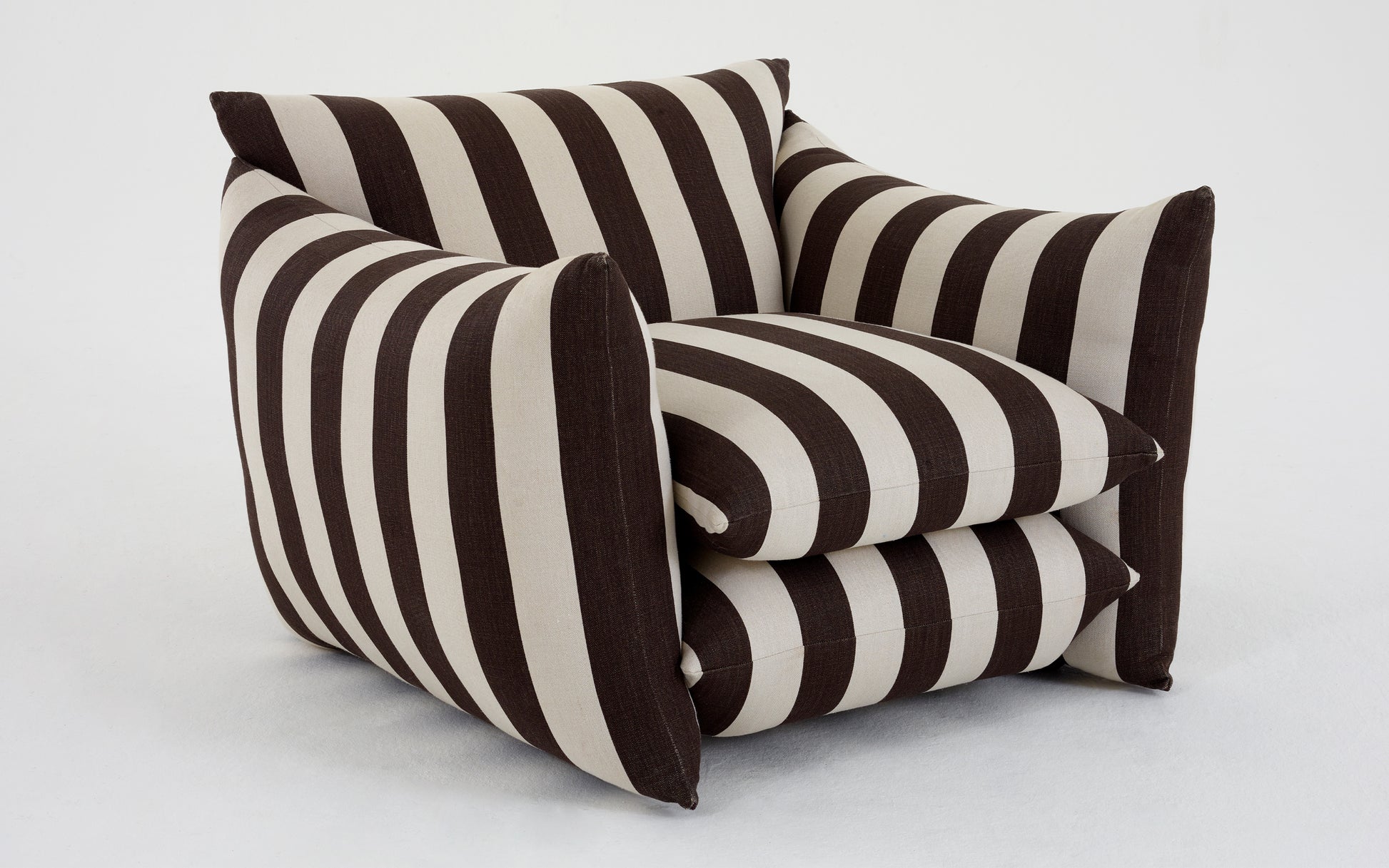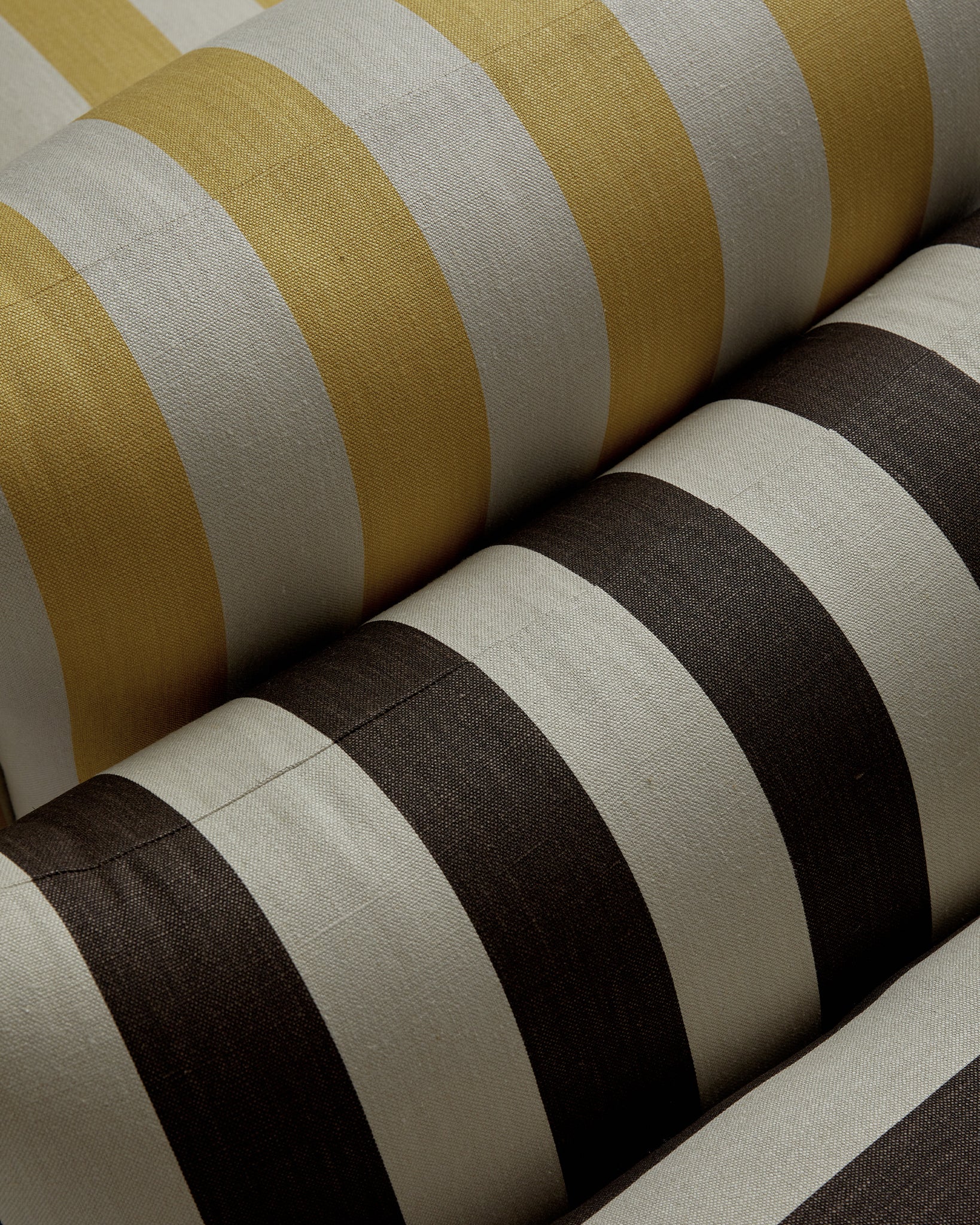 The classic stripe pattern has been designed by us, especially for the Studio Chair, and screen printed in London. We have worked closely with an expert colourist to achieve "Earth" which is an understated dark brown.