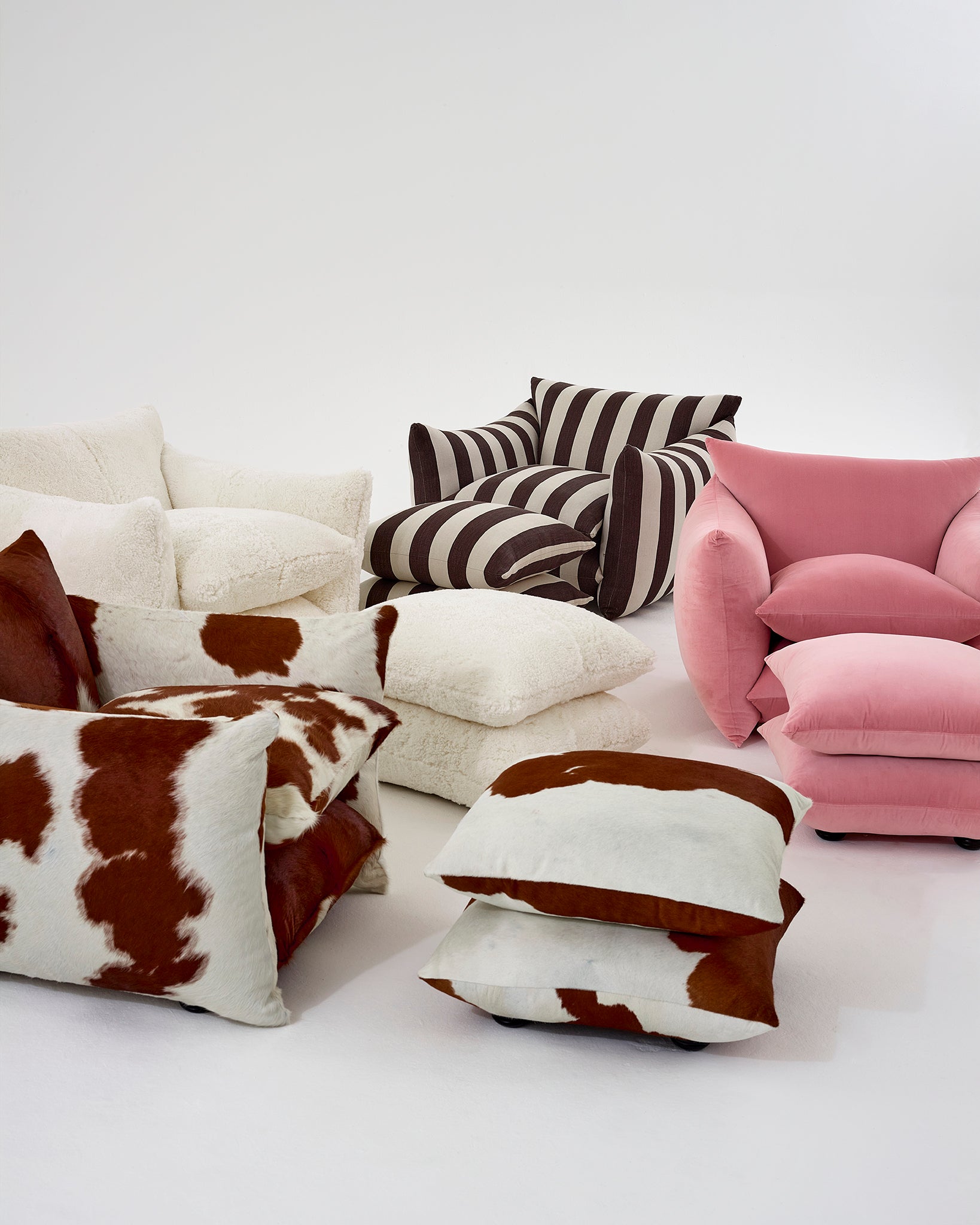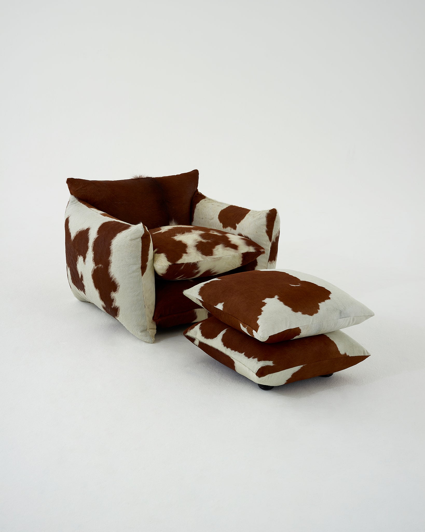 Designed to work well either used alongside the Studio Chair and Studio Sofa, or as a striking standalone piece, the Studio Stool features the same double ‘cushion’ construct with soft curves and a free-flowing form. Versatile in its use, it can serve as a seat, a side table, or a footstool. Expertly handcrafted in England in beautiful brown and white cowhide in its natural state. Playful, functional, and timeless.