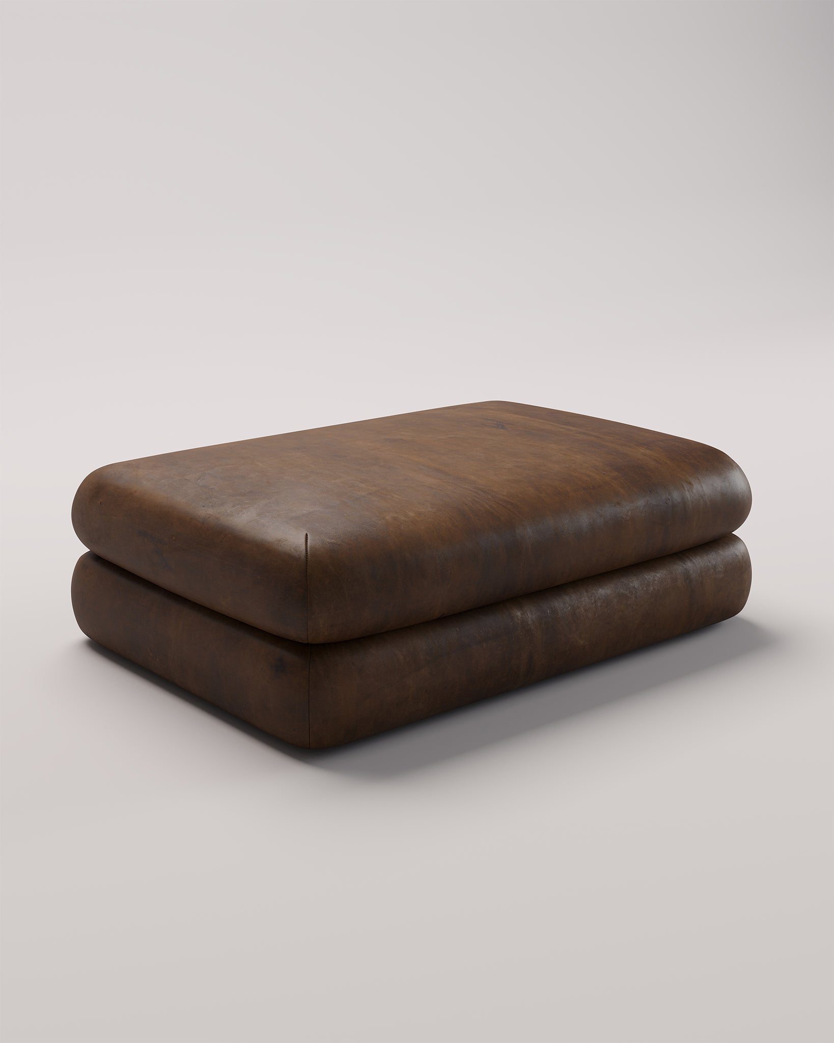Designed to work well either used alongside the Studio Chair and Studio Sofa, or as a striking standalone piece, the Studio Ottoman features the same double 'cushion' construct with soft curves and a free-flowing form. The suede straps are inspired by vintage luggage, seemingly holding the two layers together.