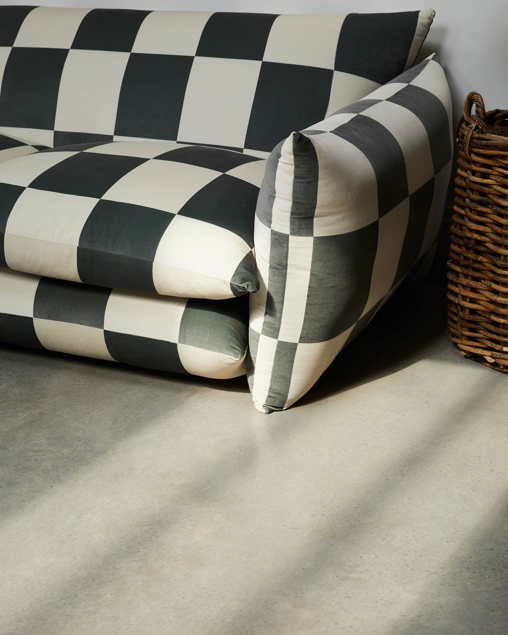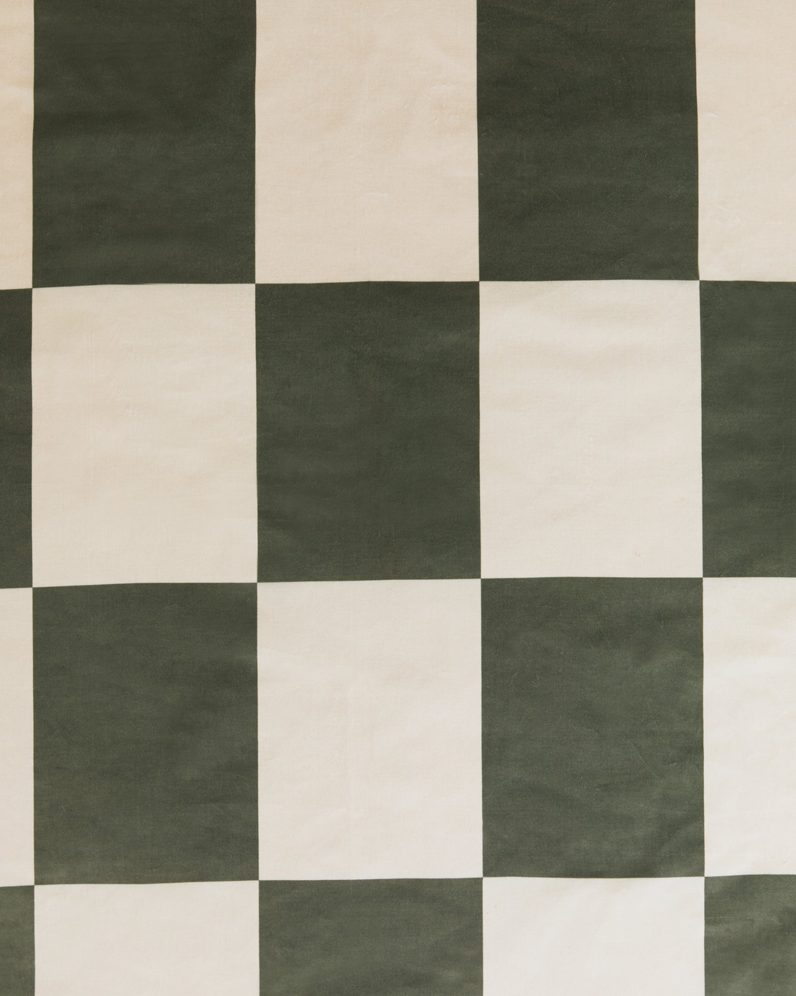 Our Checkmate velvet is an over-sized rectangular checkerboard design, printed in London onto soft cotton velvet. 'Sage' is an enigmatic dark green, 'Peony' is a pale soft pink.
