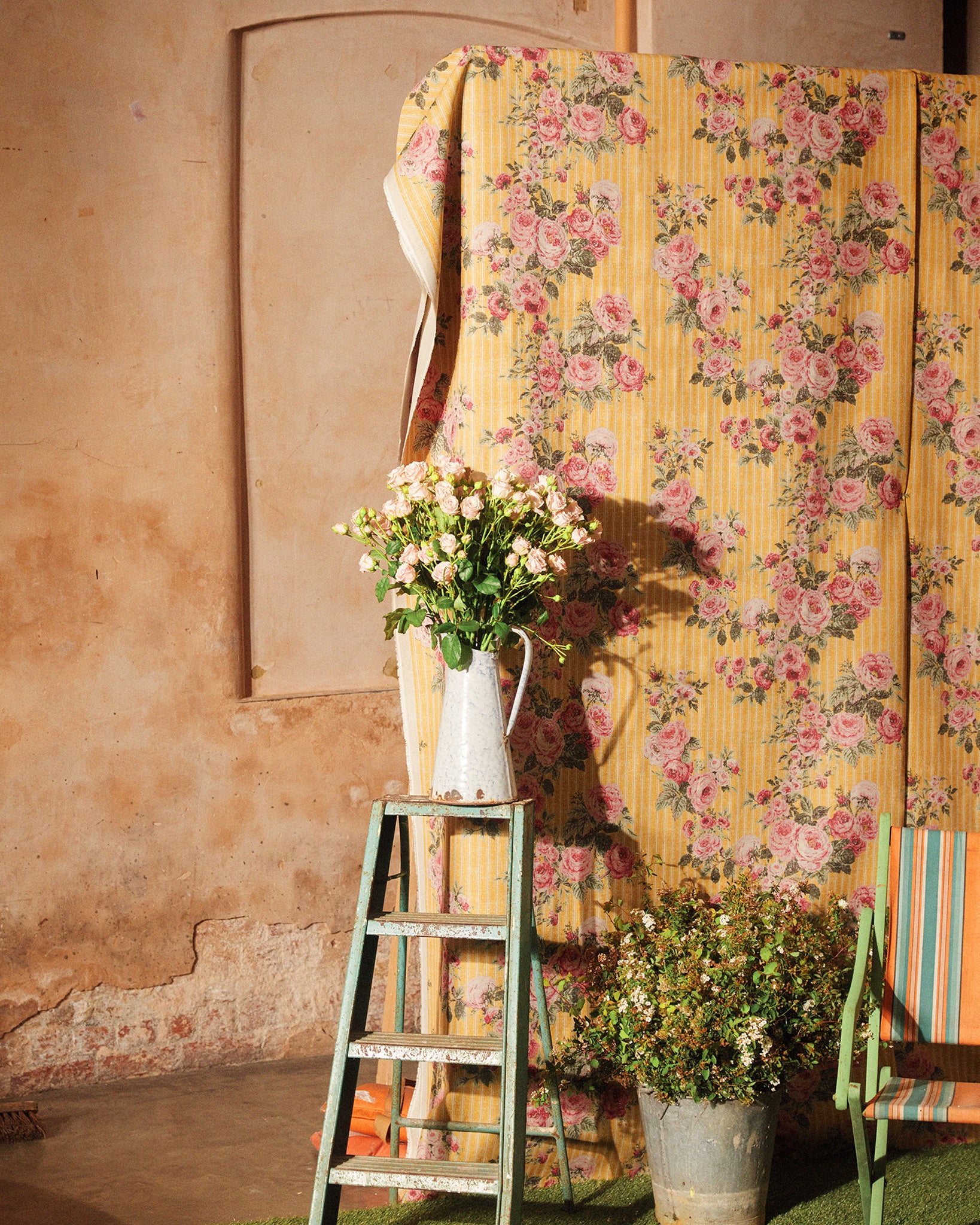 Designed in collaboration with Angus' sister, Violet Dent. Ticking Rose is inspired by the many floral fabrics that their mother Brigette collected her whole life, which were in abundance at their childhood home in the Cotswolds, England. At once nostalgic and novel, textured roses bloom across a background with a wash of colour which uses a 'reversed' ticking stripe. The print has had texture worked through it to achieve a beautiful vintage and 'worn-in' feeling. Digitally printed onto our signature heavyweight 100% Belgian Linen, ridiculously soft with beautiful natural slubs.